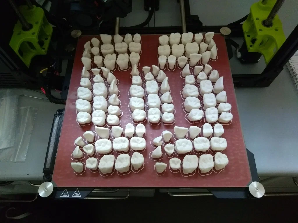 Mô hình răng người lớn phóng đại phục vụ giảng dạy hình thái học nha khoa. Một tệp bao gồm một nửa cung hàm trên và một nửa cung hàm dưới bên phải (được sắp xếp để tối ưu hóa không gian in trên bàn in), tệp thứ hai là trọn bộ đầy đủ.