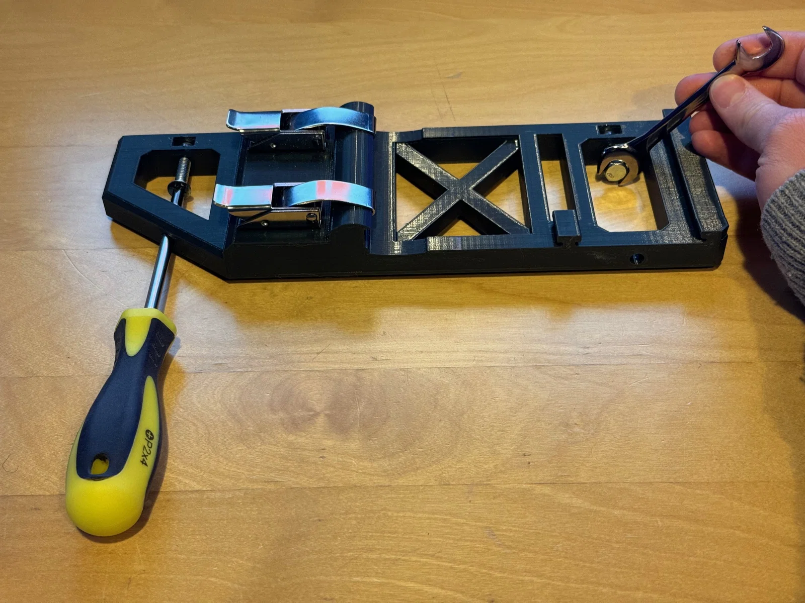 - Gắn các chốt khóa (tôi dùng loại này từ Amazon) bằng vít M4x20mm, long đền và đai ốc. Bạn có thể dùng vít M4x25mm nếu muốn thoải mái hơn. Luồn bu lông M4 ngược từ dưới lên để đầu bu lông nhô lên trên. Đưa đầu vít M4 vào lỗ trên đế chốt, siết đai ốc lại bằng kìm giữ đai ốc và dùng lục giác 3mm để siết vít M4.