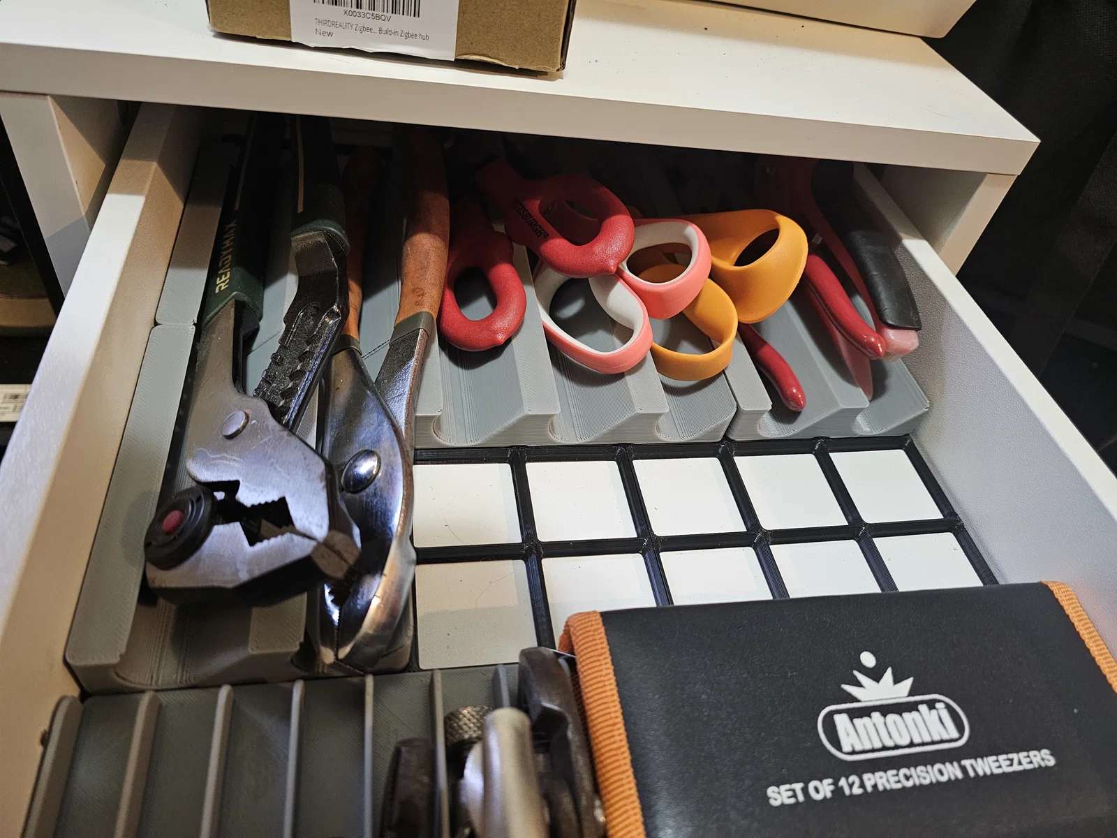 Các khay đựng kìm giúp bạn sắp xếp ngăn kéo gọn gàng hơn. Bản remix này của mình cho phép bạn thiết kế các hàng với số lượng lẻ tùy theo nhu cầu. Mình đã tạo ra khay rộng 3 ô thay vì 1 ô, vì mình thấy loại 1 ô không đứng vững được do thiết kế dạng đòn bẩy (cantilevered). Hơn nữa, những khay như thế này thường dùng cho các loại kìm nặng, vốn không vừa với các khay nhỏ có sẵn.