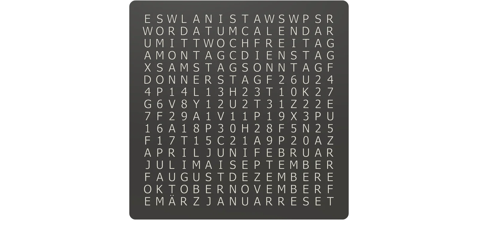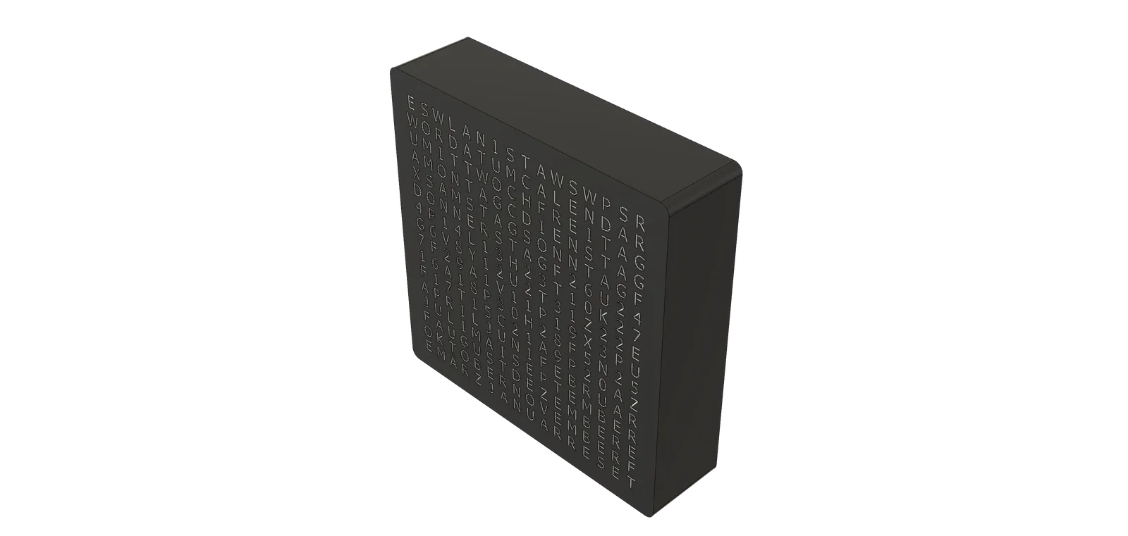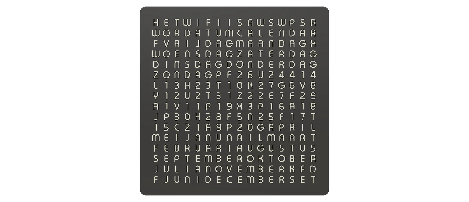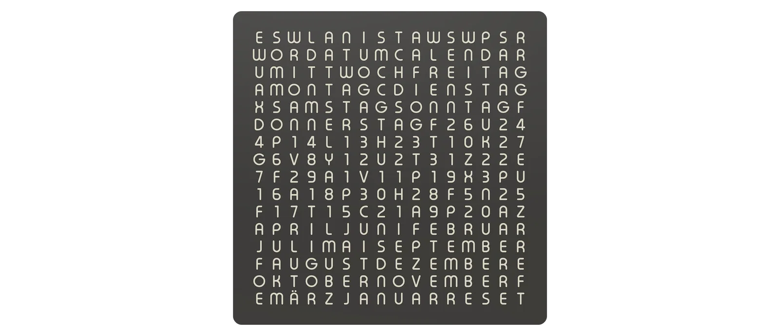 Đây là hình ảnh WordCalendar đặt cạnh một chiếc WordClock 16x16 - 2024 phiên bản tiếng Đức cũng như khi đứng độc lập: