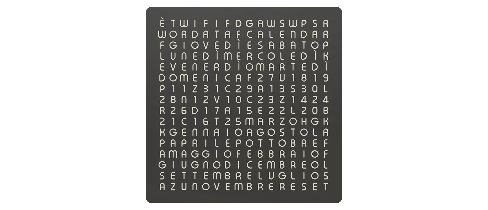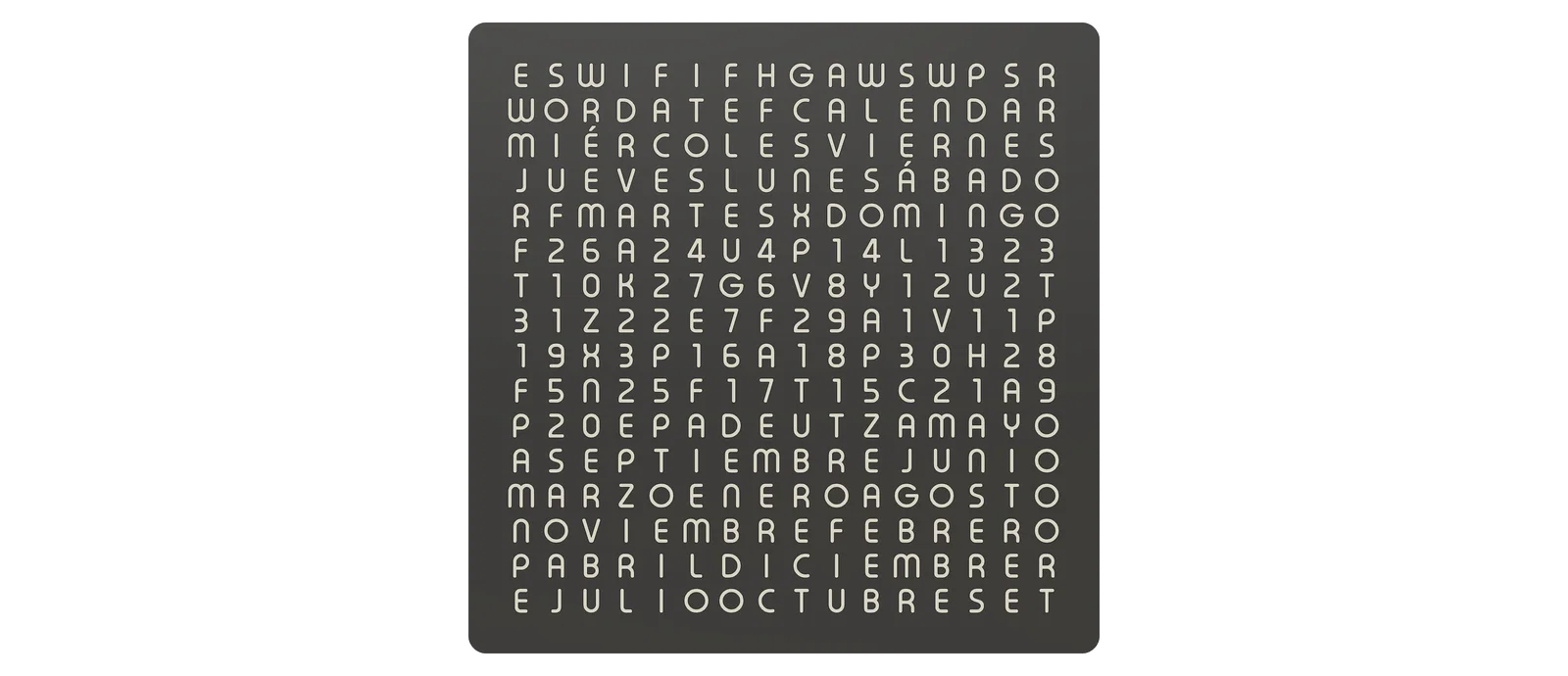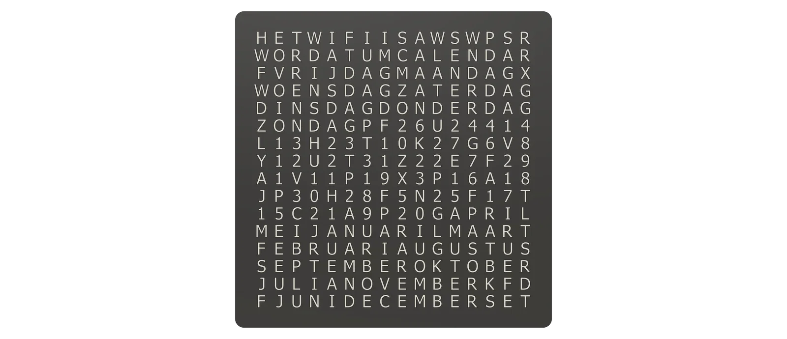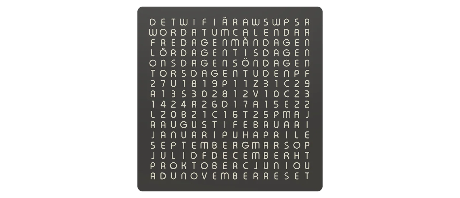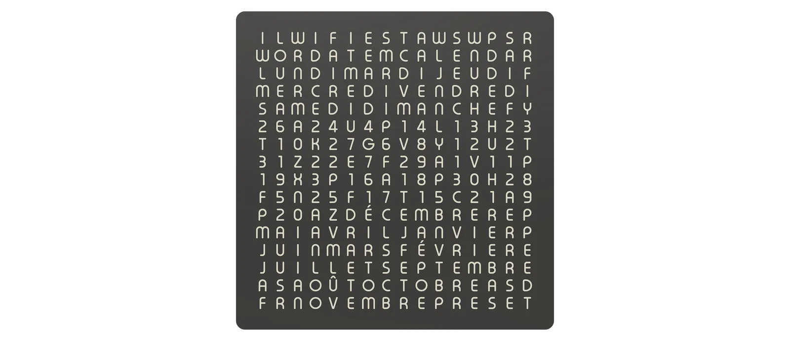 Đây là hình ảnh WordCalendar đặt cạnh một chiếc WordClock 16x16 - 2024 phiên bản tiếng Đức cũng như khi đứng độc lập: