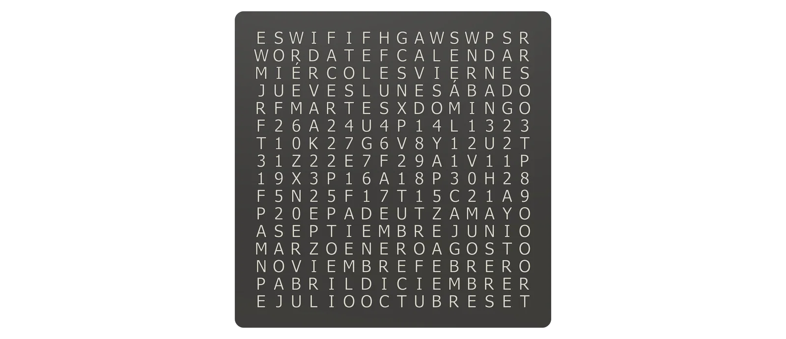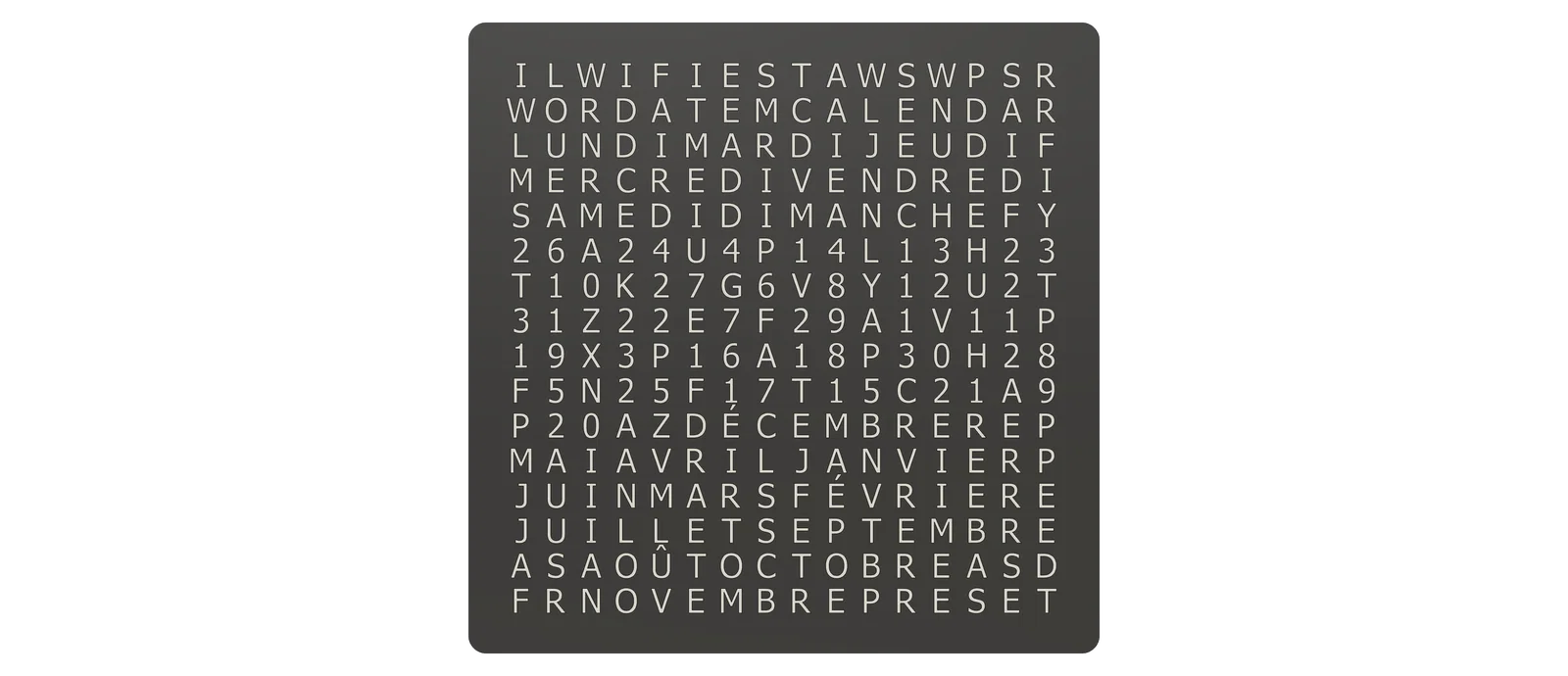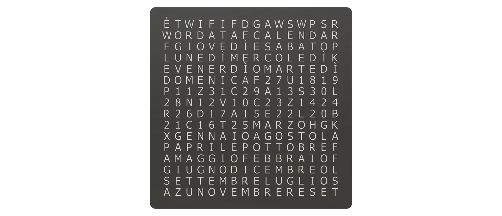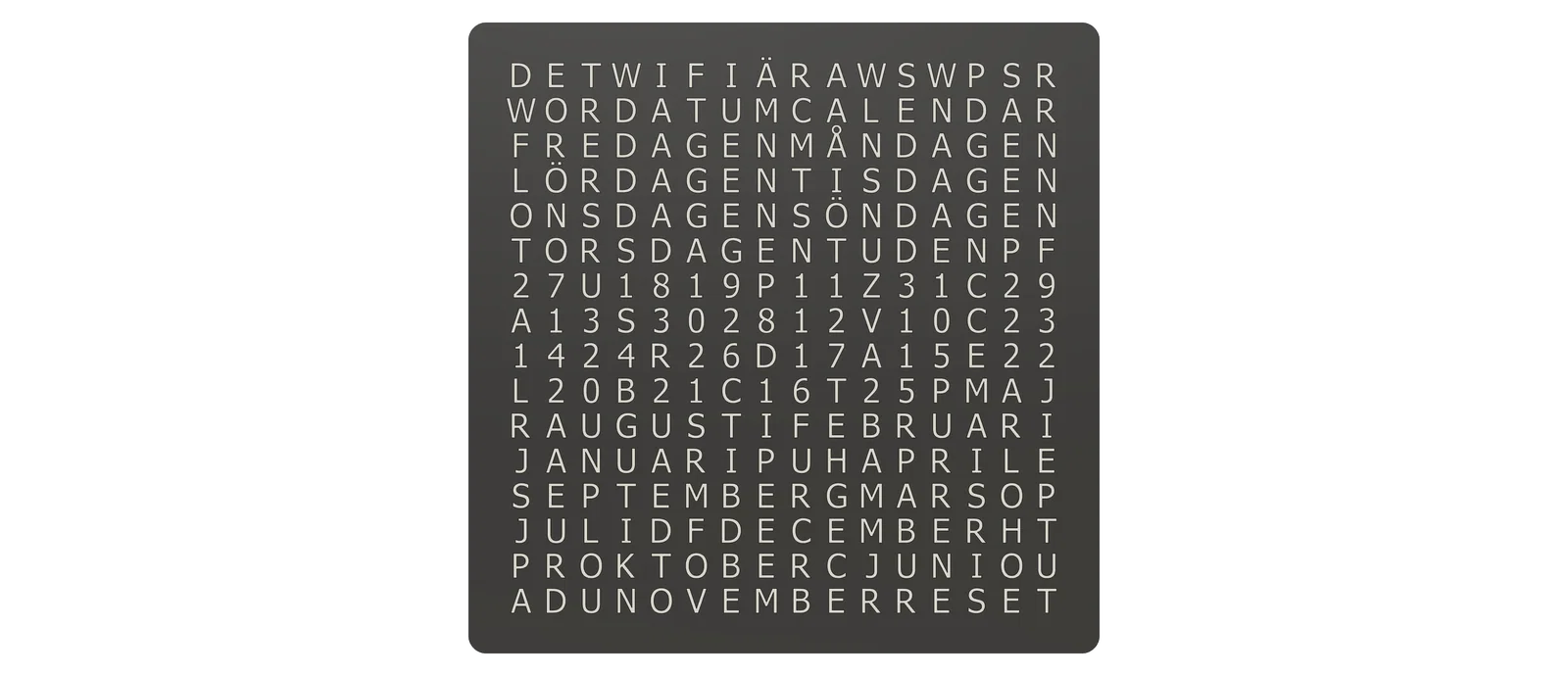 Đây là hình ảnh WordCalendar đặt cạnh một chiếc WordClock 16x16 - 2024 phiên bản tiếng Đức cũng như khi đứng độc lập: