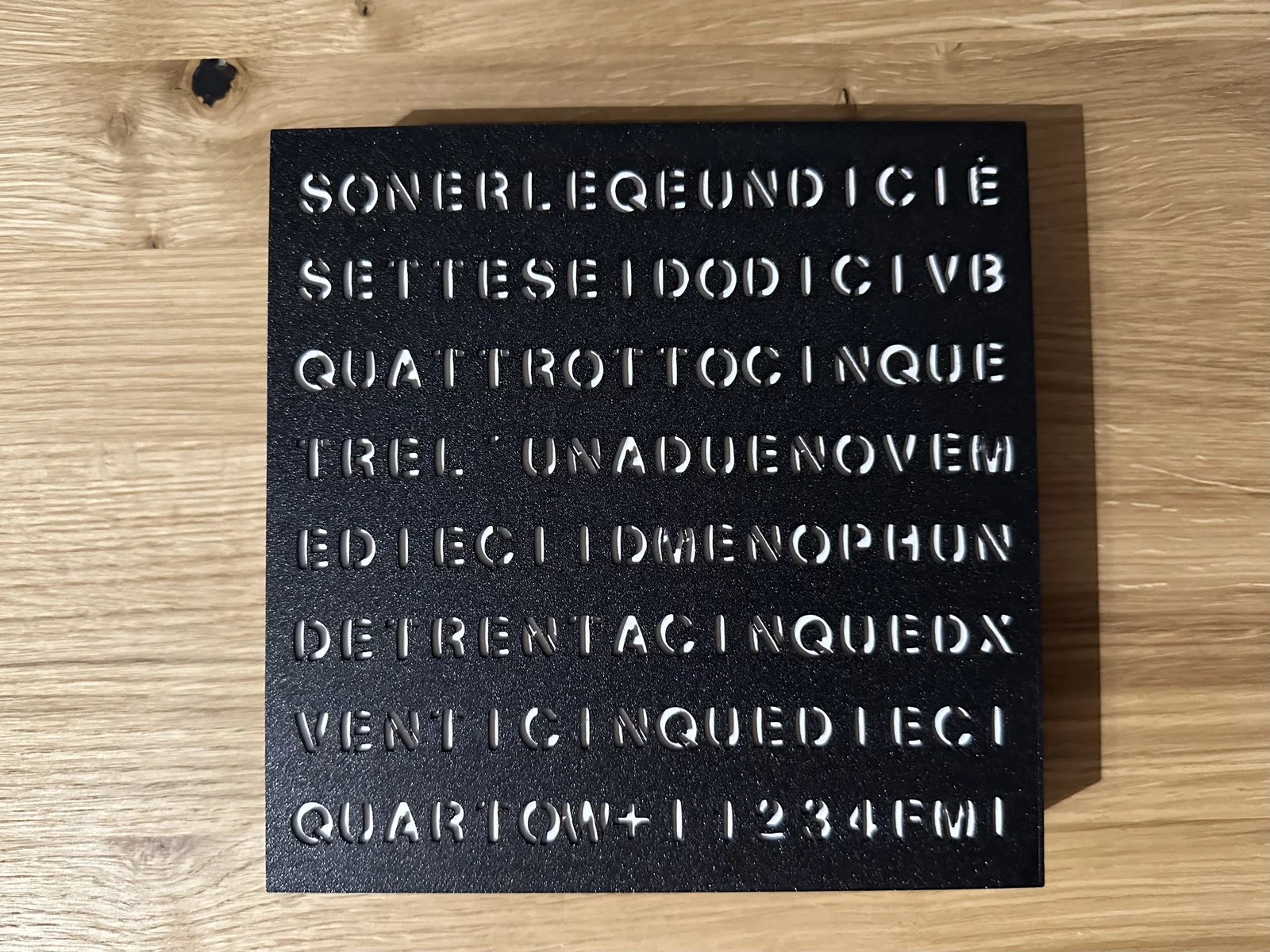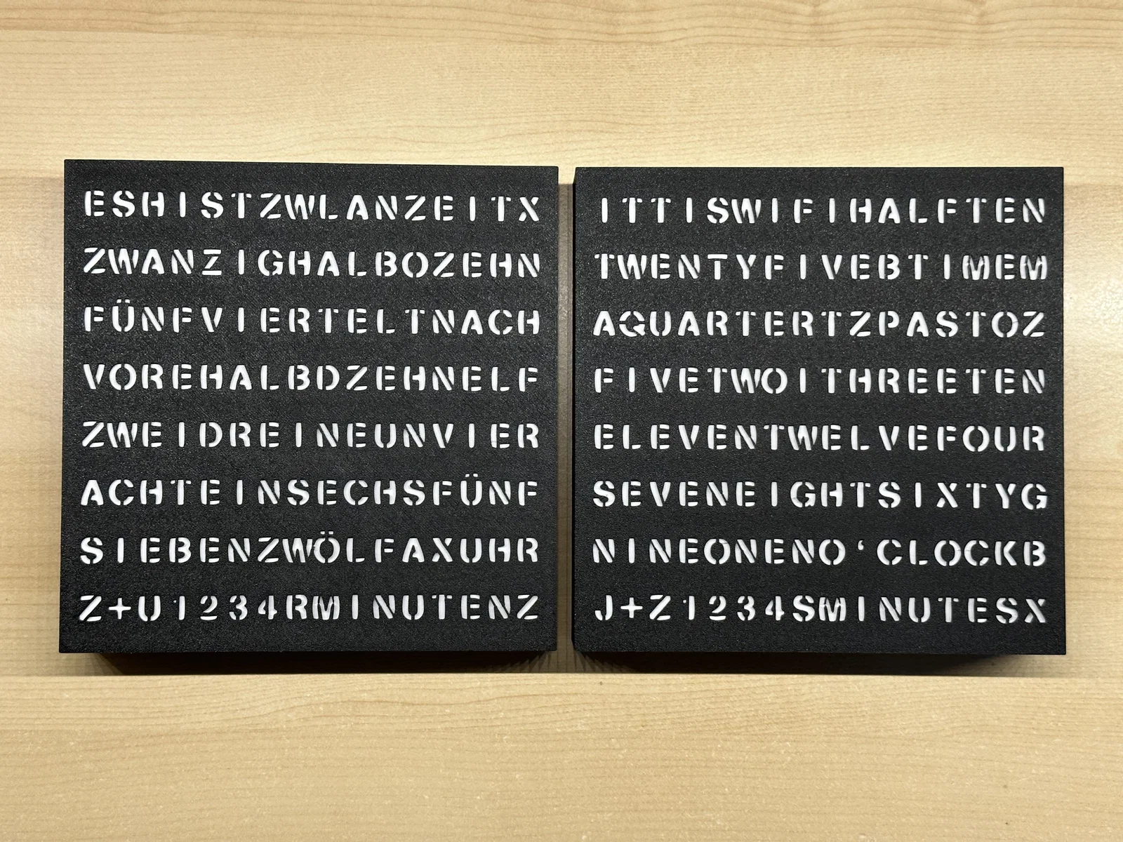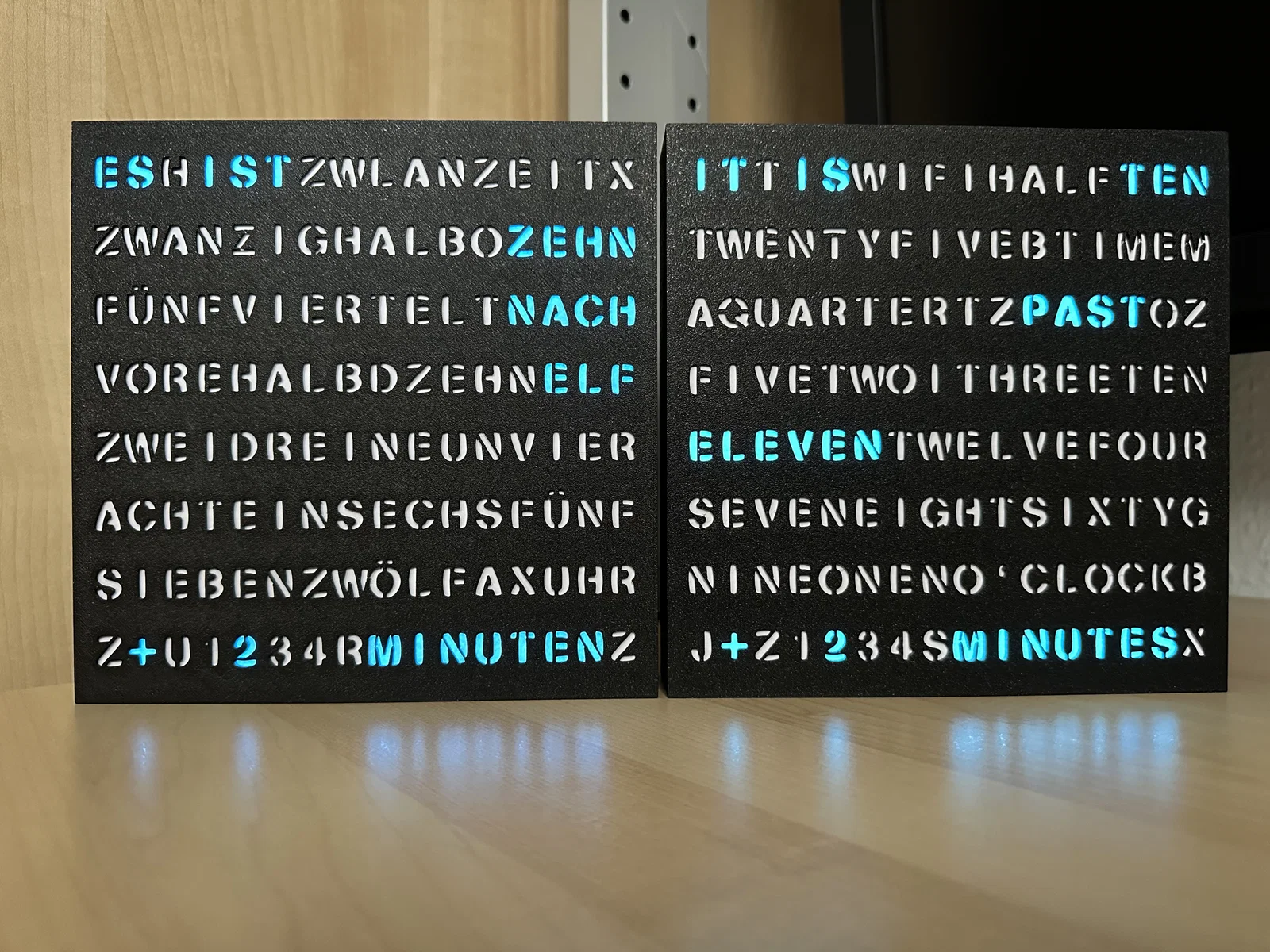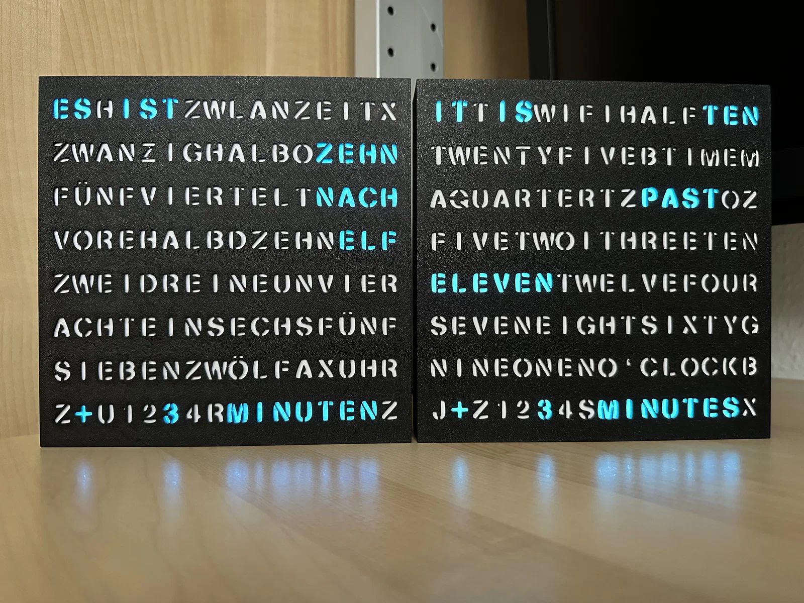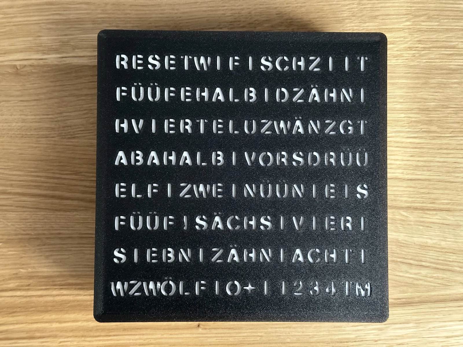 Đây là phiên bản 2023 đầu tiên của tôi dựa trên mẫu WordClock cũ, đã loại bỏ các từ phụ không cần thiết. Dự án hiện sử dụng ma trận 16x16 thay vì 10 dải LED như trước đây. Điều này giảm thời gian in từ 22,25 giờ xuống còn 14,5 giờ và công đoạn hậu kỳ giảm từ 4-5 giờ xuống còn khoảng 15-30 phút… Tôi cũng đã viết lại phần lớn mã nguồn để tối ưu hơn, tích hợp giao diện web hoàn toàn mới và phương thức lưu cấu hình mới giúp loại bỏ nút "Save". Mã nguồn sẽ được cập nhật liên tục… Hy vọng các bạn thích phiên bản mới này!