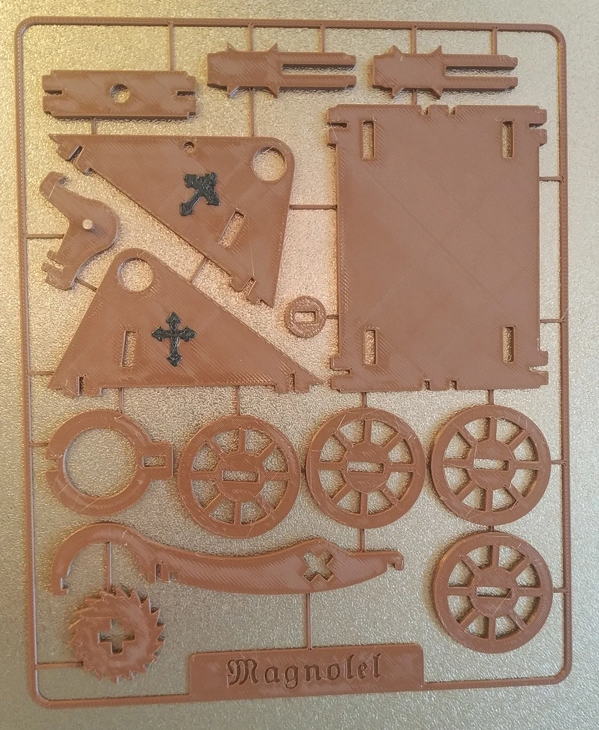 Mô hình máy bắn đá (catapult) dùng để phóng các quả bóng nhỏ. Lực bắn sẽ phụ thuộc vào độ căng của dây thun. Bạn có thể dùng phần "mỏ" để cố định máy, nhắm mục tiêu, sau đó nhấn nút trên mỏ để bắn.
