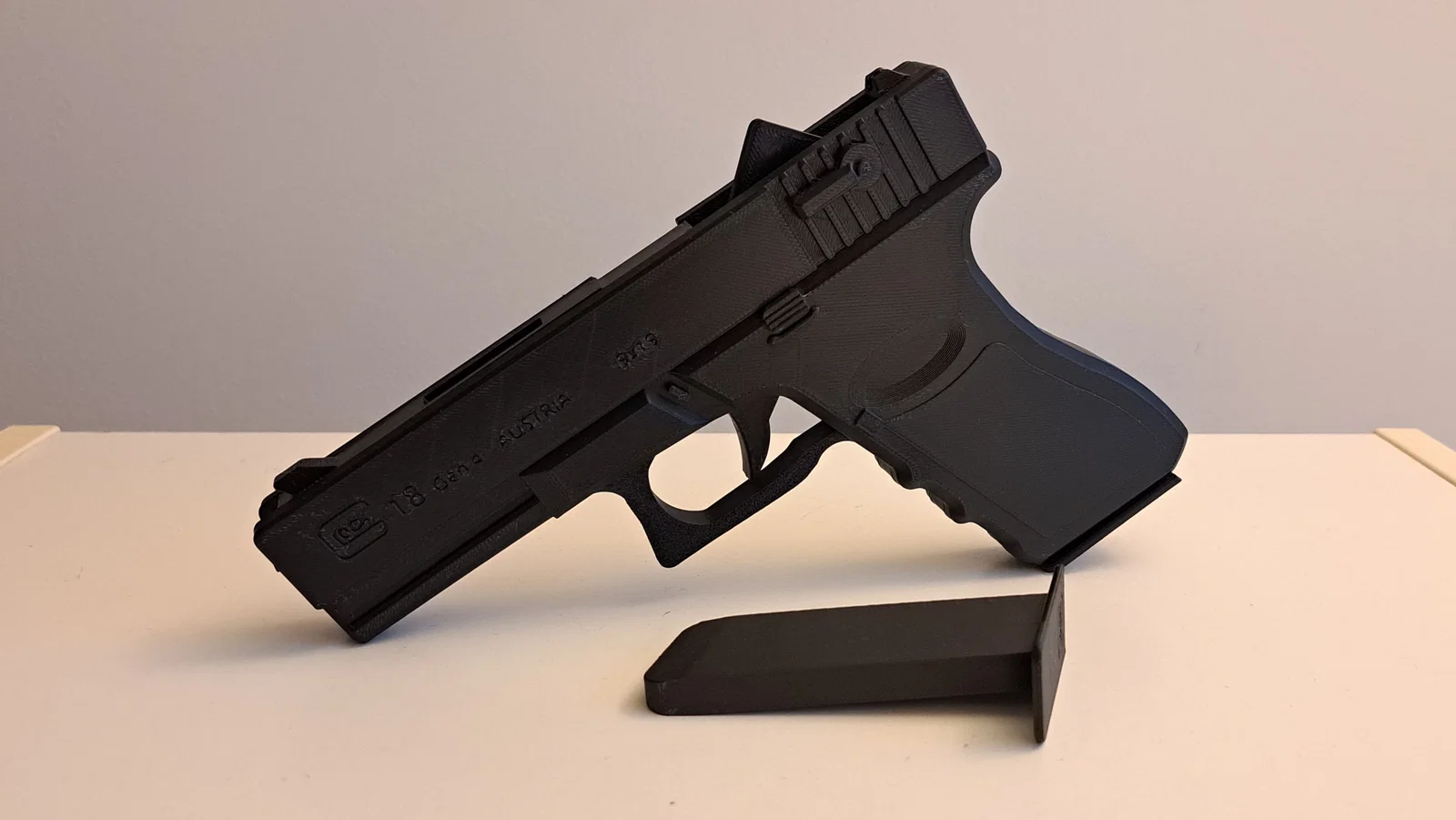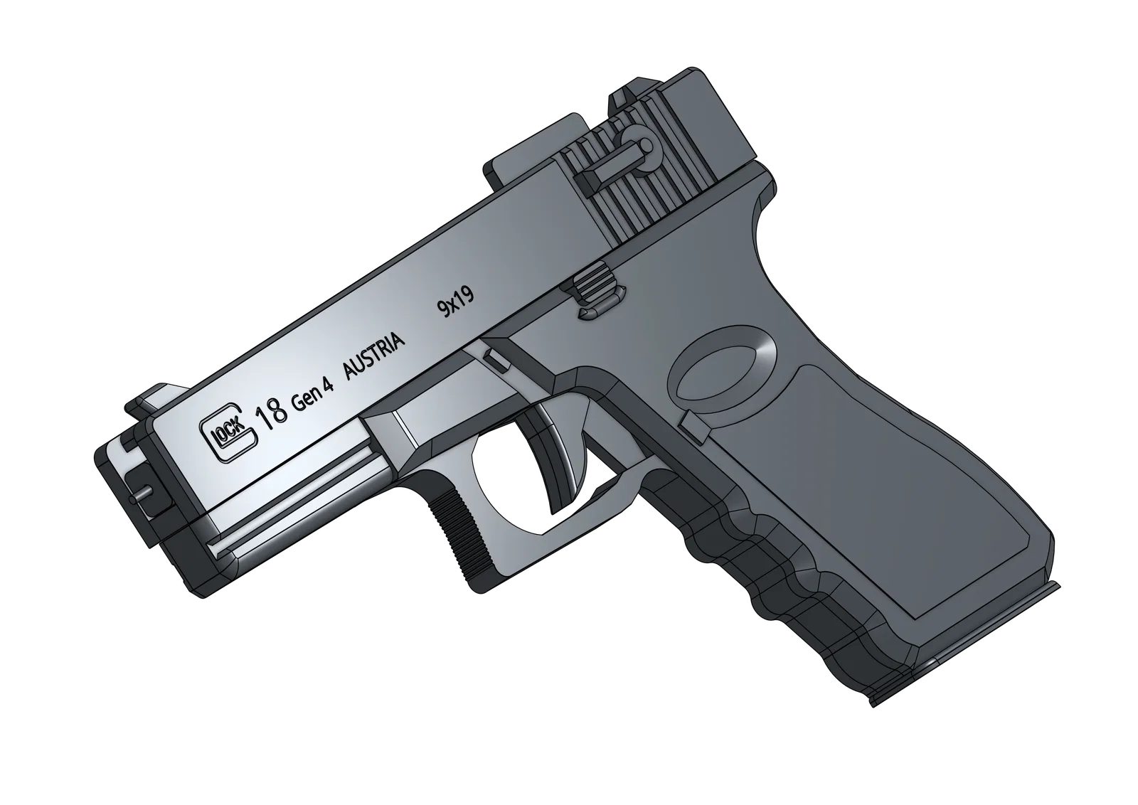 Bản sao 1:1 của súng Glock 18 in 3D với cơ chế bắn dây thun bán tự động. Thiết kế đơn giản, dễ lắp ráp, có chức năng blowback và khoang chứa đạn dự phòng.