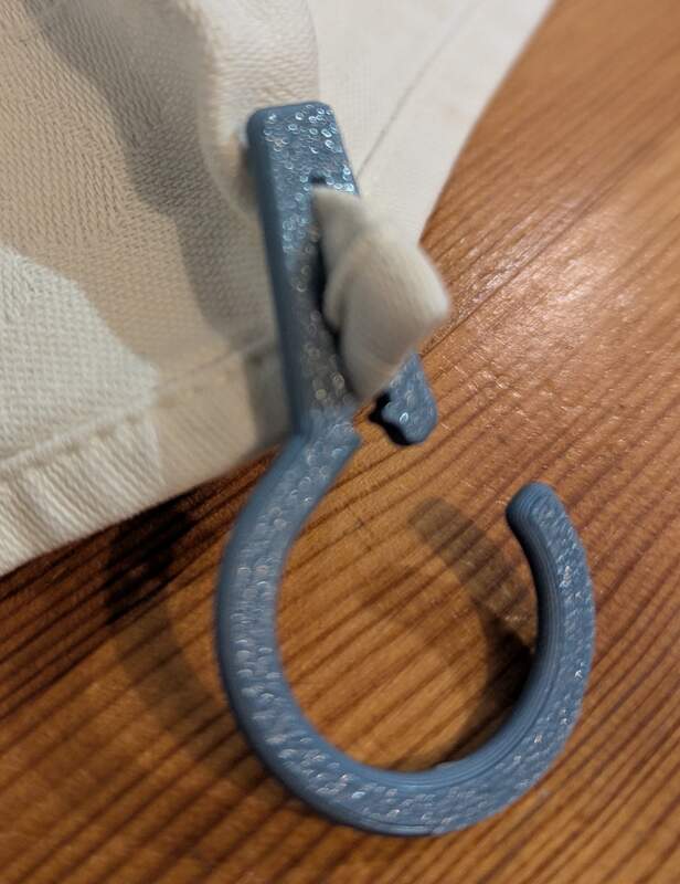 Bộ 2 móc treo phù hợp để in bằng hầu hết các loại vật liệu cứng. Khe cắm cam có 2 bộ phận giữ bên trong giúp bám chặt vào hầu hết các loại vải. Sản phẩm hoạt động tốt nhất khi in với đầu phun 0.4mm và độ cao lớp in 0.2mm. Khuyến khích sử dụng chế độ in đặc (solid infill) để đảm bảo độ bền tối đa. Ảnh minh họa cho thấy cách sử dụng thực tế. Nếu vải của bạn không có viền, hãy gấp lại để tạo nếp. Thiết kế có các gờ khóa kép chạy dọc hai bên cam; các "chiếc răng" này giúp ngăn chặn việc móc bị tuột ra ngoài ngoài ý muốn.