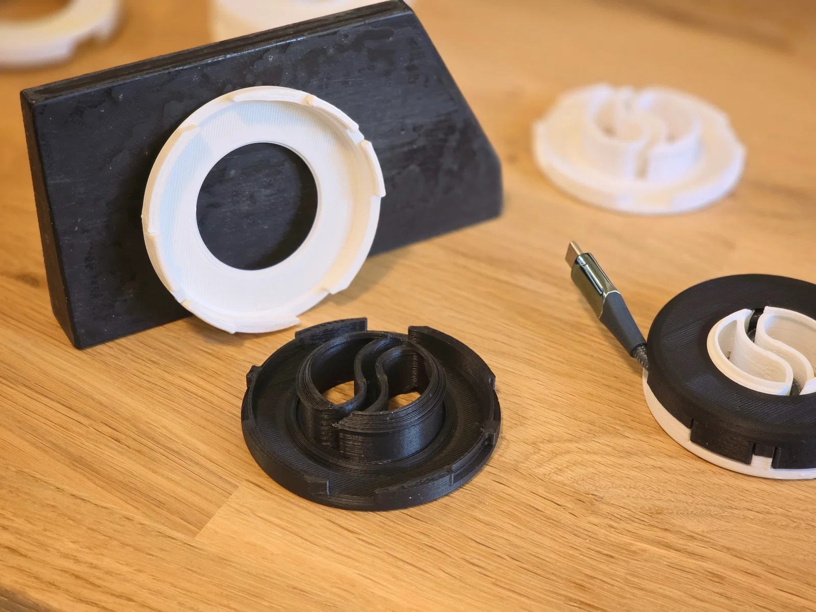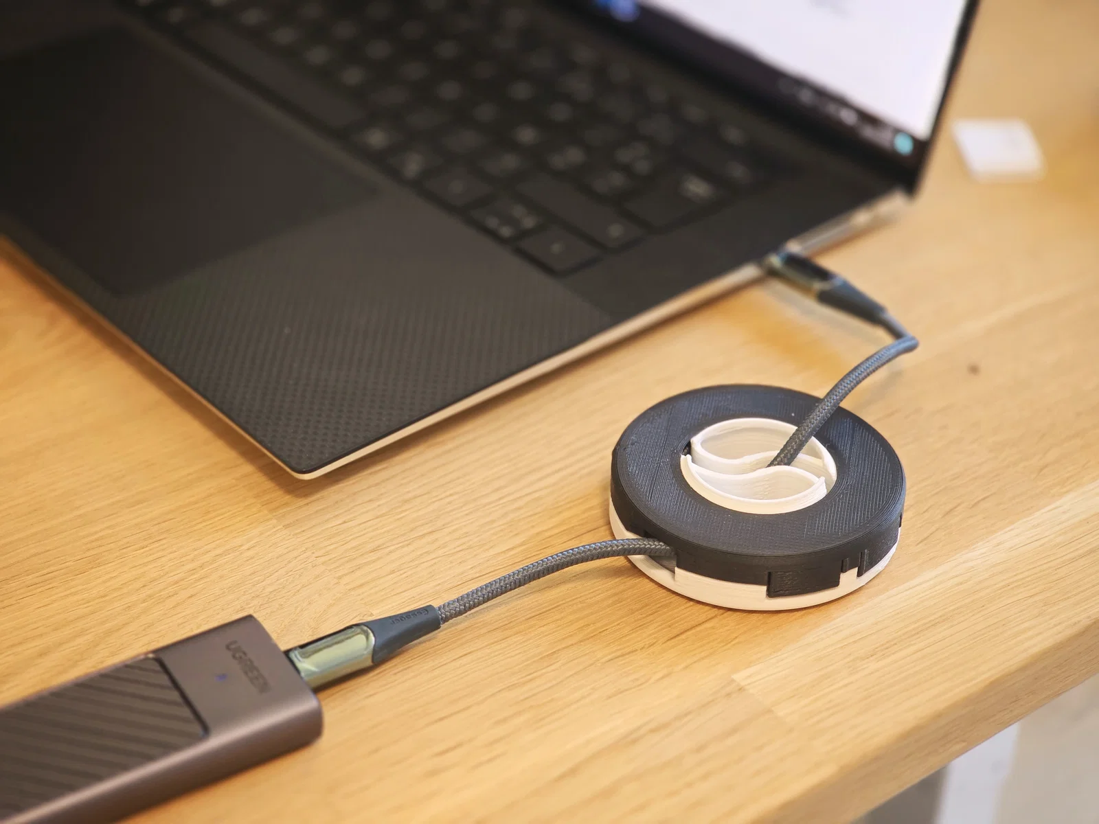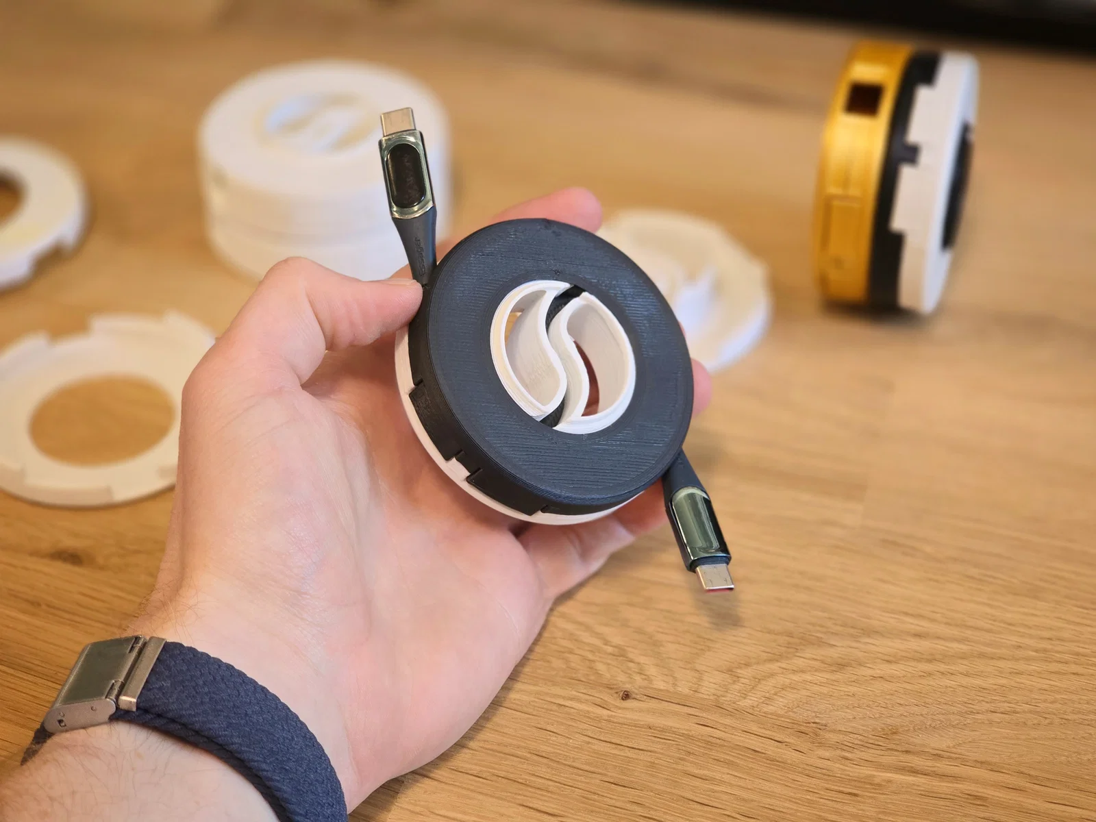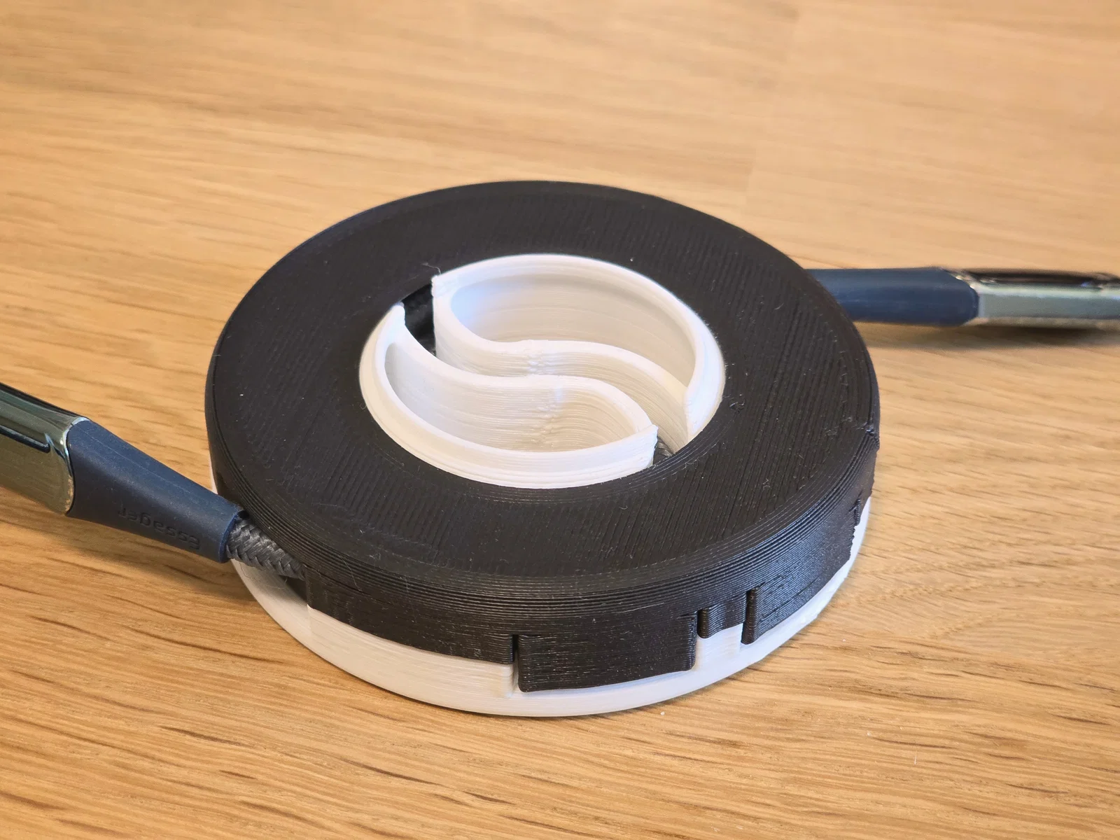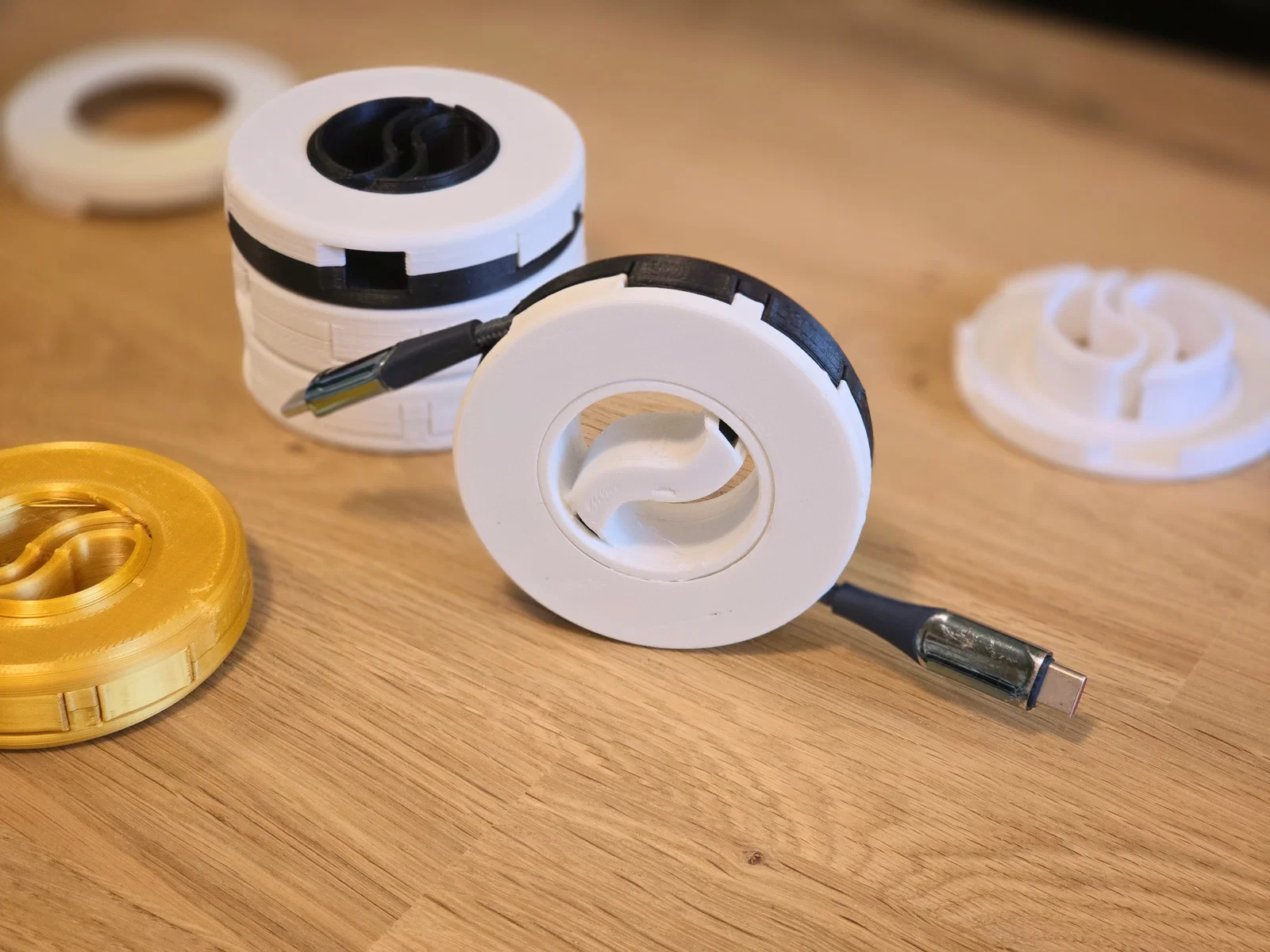 Bộ cuốn dây cáp in-một-lần (print-in-place) có khả năng tùy chỉnh theo kích thước dây của bạn. Thiết kế thông minh cho phép cuốn một hoặc hai đầu dây, hỗ trợ tính năng xếp chồng và có các file FreeCAD để tùy biến thoải mái.