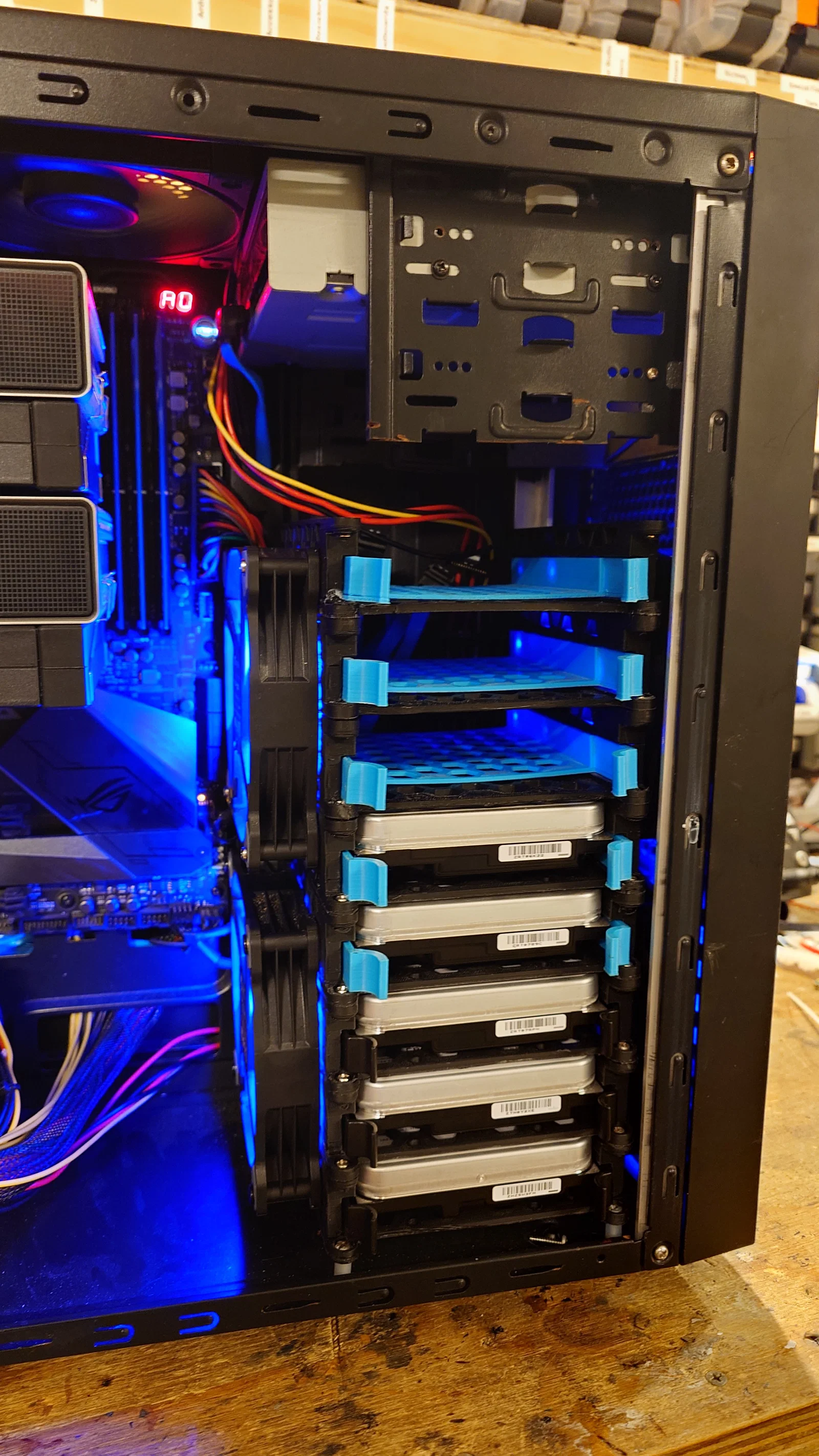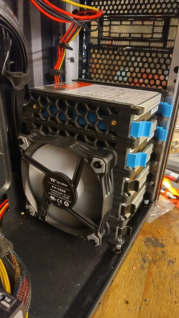 Đây là khay ổ cứng 3.5" có thể xếp chồng lên nhau, cho phép bạn tháo lắp từng ổ cứng một cách độc lập. Khay được lắp ráp bằng ốc M3 và heat set inserts 5 mm. Ngoài ra, thiết kế này còn hỗ trợ gắn thêm quạt 120 mm ở một trong hai bên để giúp tản nhiệt hiệu quả hơn.