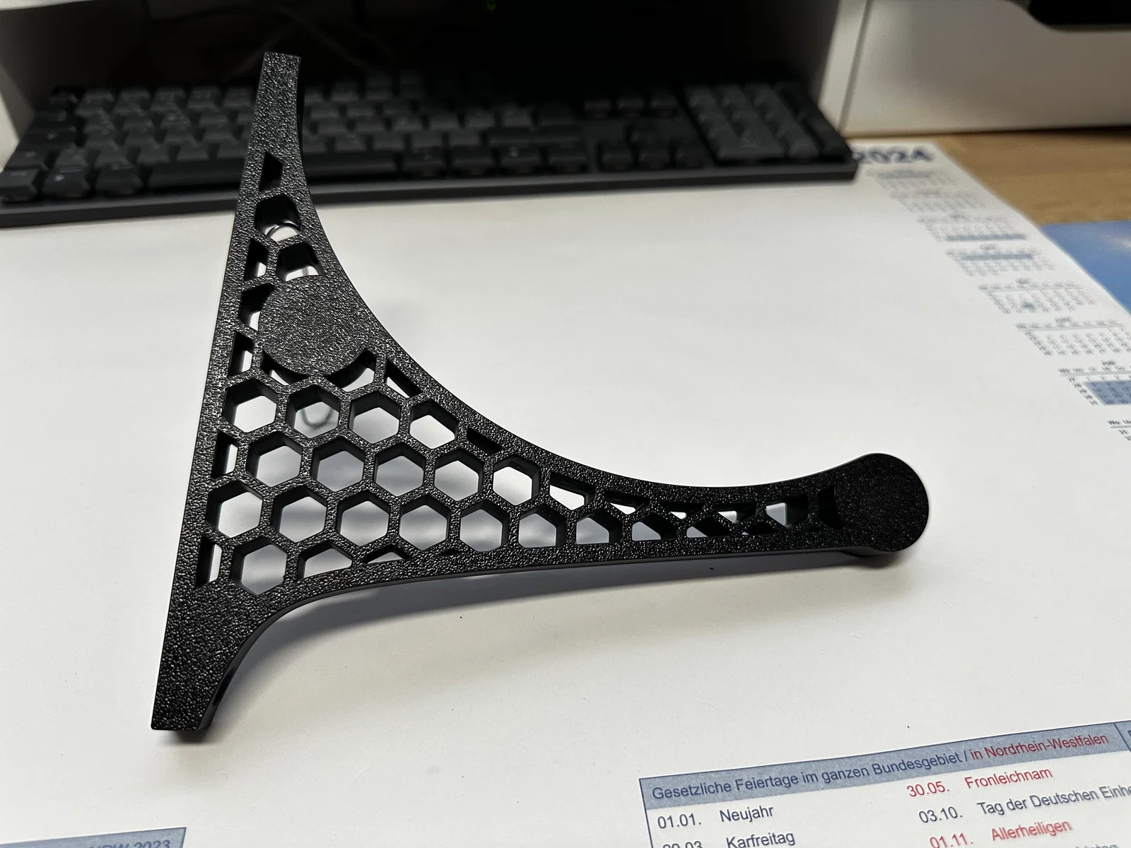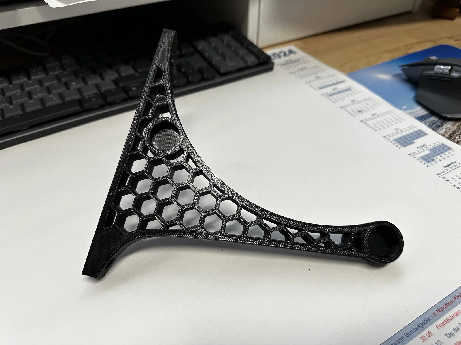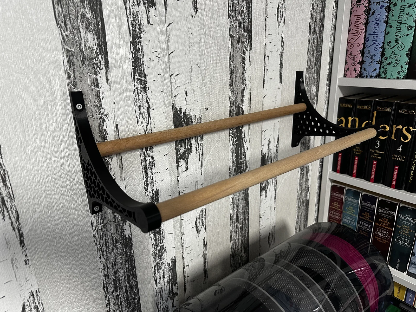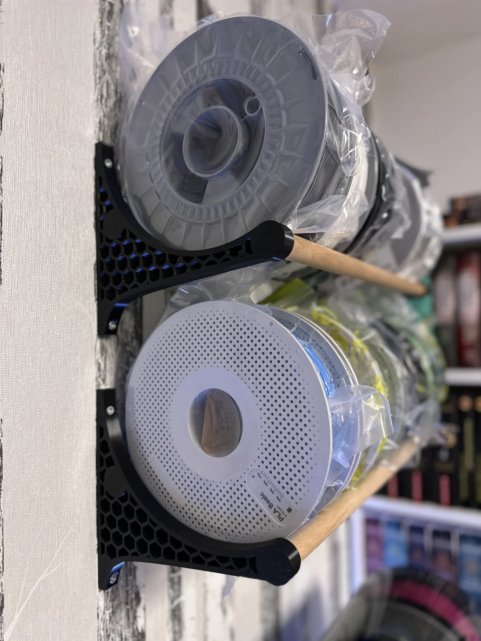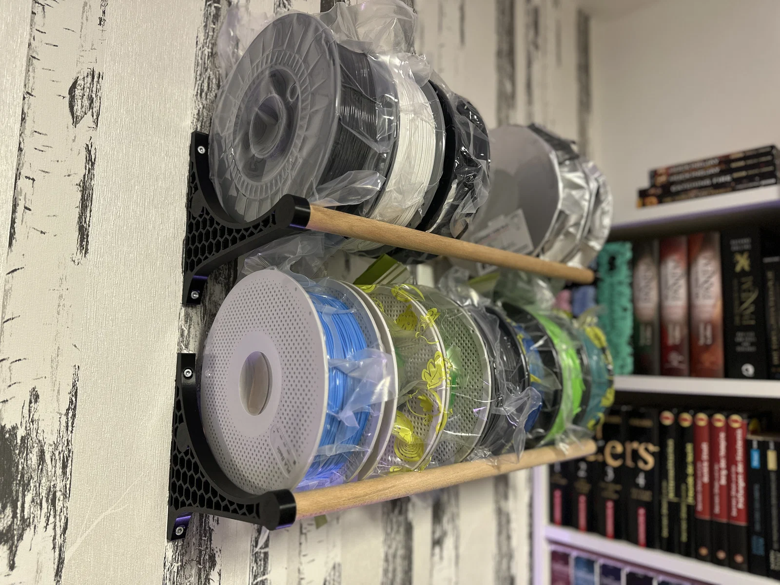Đây là một mẫu kệ đựng filament thiết kế theo phong cách hình lục giác dành cho các cuộn có đường kính 200mm. Đối với các thanh ngang, mình sử dụng thanh gỗ sồi tròn dài 500mm với đường kính 20mm. Trong trường hợp của mình, kệ chứa được 7 cuộn với chiều rộng khoảng +/- 65mm. Mẫu này được in từ khoảng 185g nhựa PETG, thiết lập 6 tường (walls), 25% infill với chiều cao lớp in 0,2mm. Mình cũng đã thêm một giá đỡ có lỗ xuyên tâm để gia cố cho phần giữa của những chiếc kệ dài hơn.