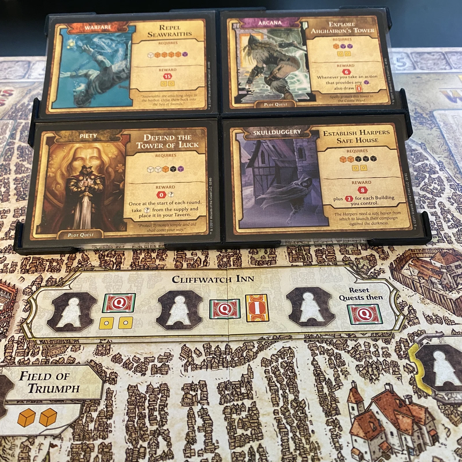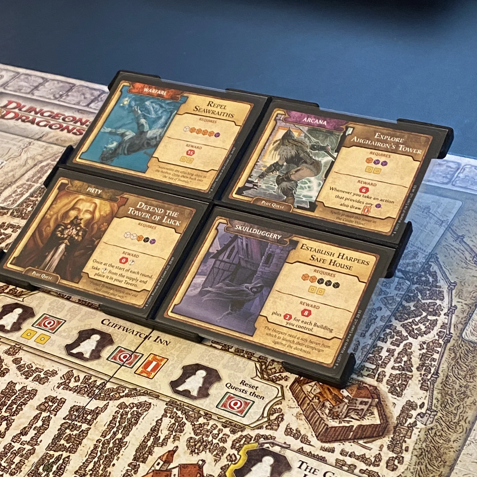 Có người trên BoardGameGeek hỏi xin khay để chuyền bốn nhiệm vụ (Quest) tại Cliffwatch Inn quanh bàn, giúp mọi người dễ đọc hơn. Đây là bản thiết kế của mình. Khay được làm cho thẻ có bọc (sleeved) nhưng dĩ nhiên vẫn dùng tốt với thẻ thường không bọc.