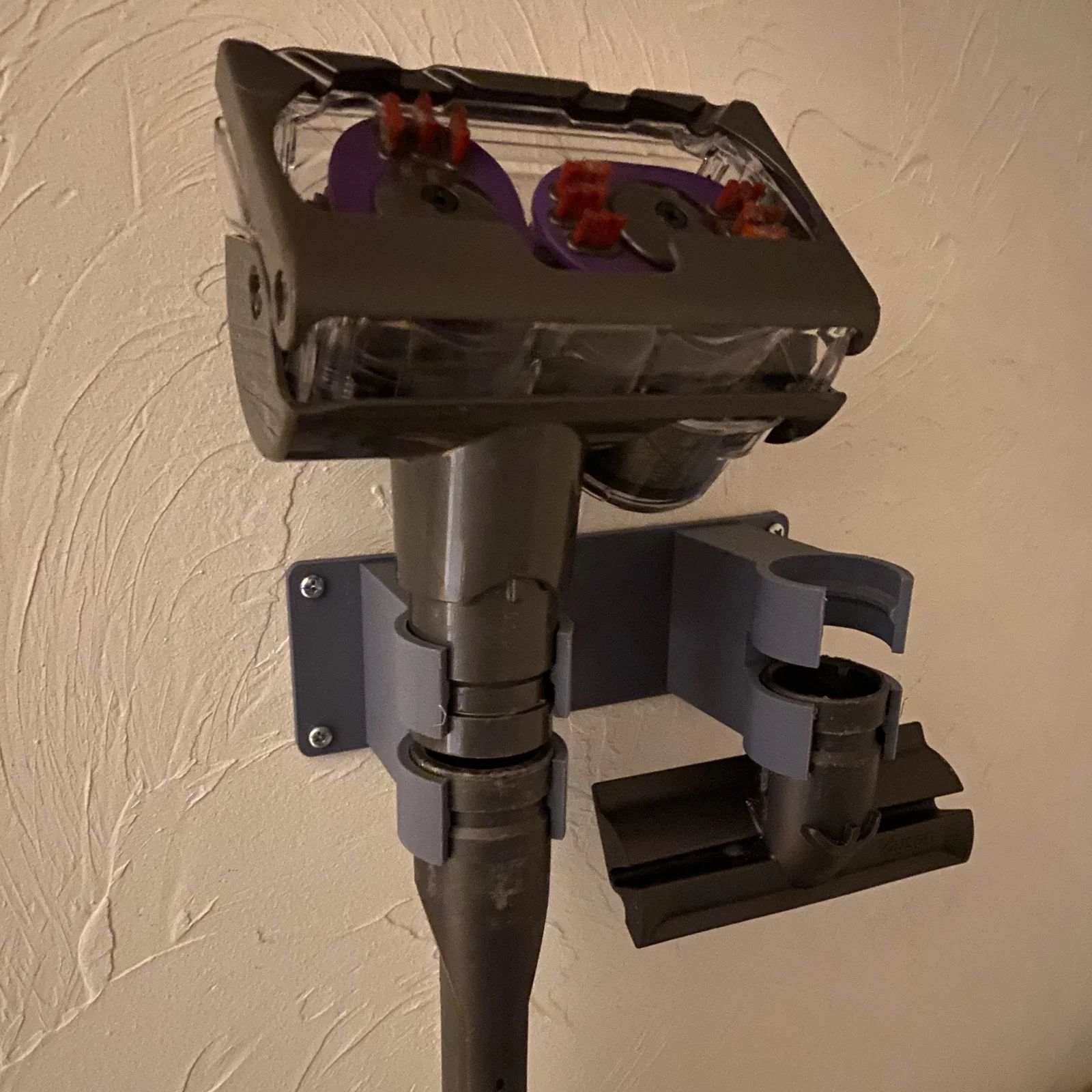 Đây là mẫu giá treo tường được thiết kế lại để giữ 4 phụ kiện cho máy hút bụi Dyson v6. Thiết kế này khắc phục nhược điểm dễ gãy của bản cũ, giúp các đầu hút trượt vào nhẹ nhàng, chắc chắn khi in bằng nhựa PLA Plus.