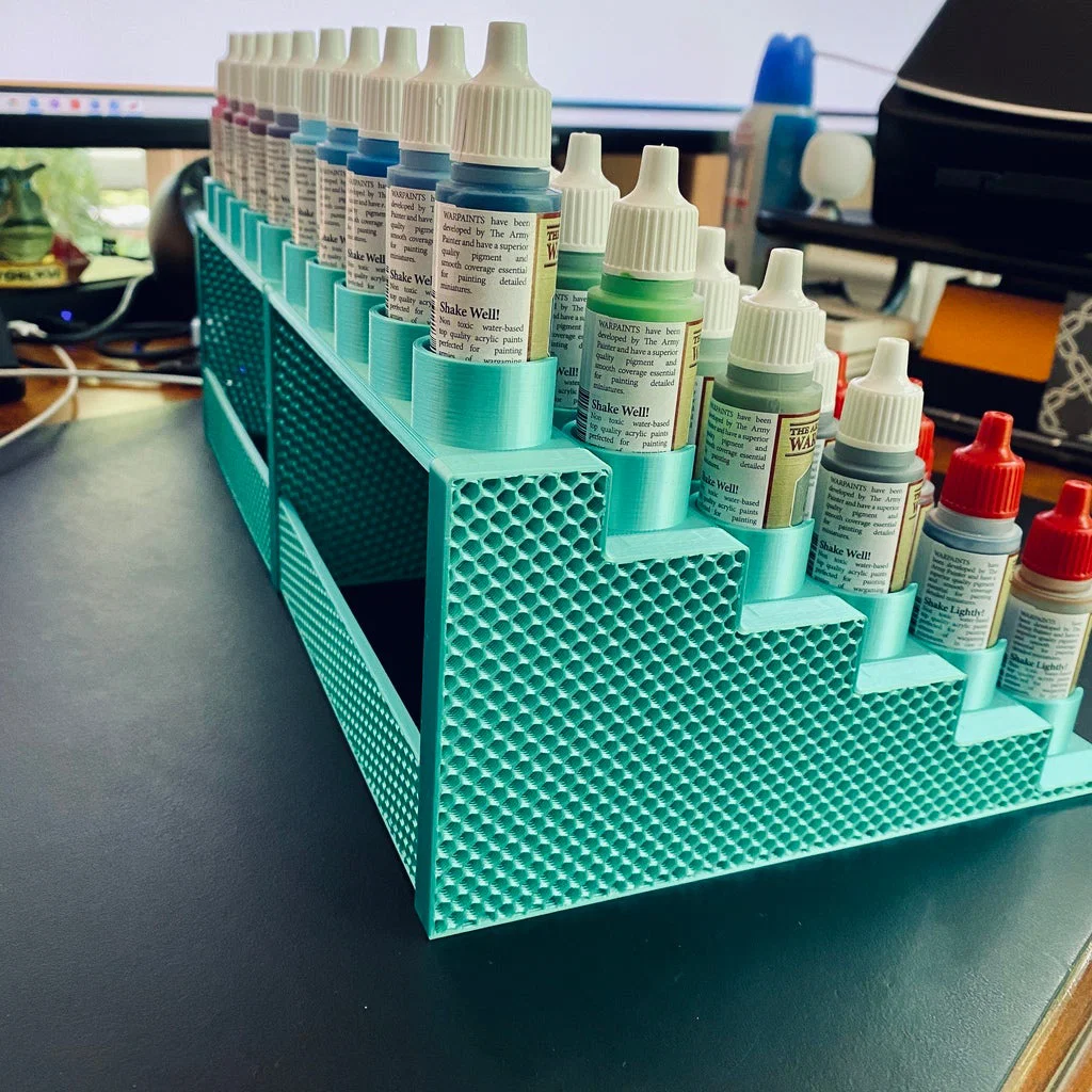 Cập nhật 10-1-2024: Đã thêm các tầng "so le" để bố trí các lọ sơn lệch nhau (theo gợi ý của @Xellixor trên Thingiverse).