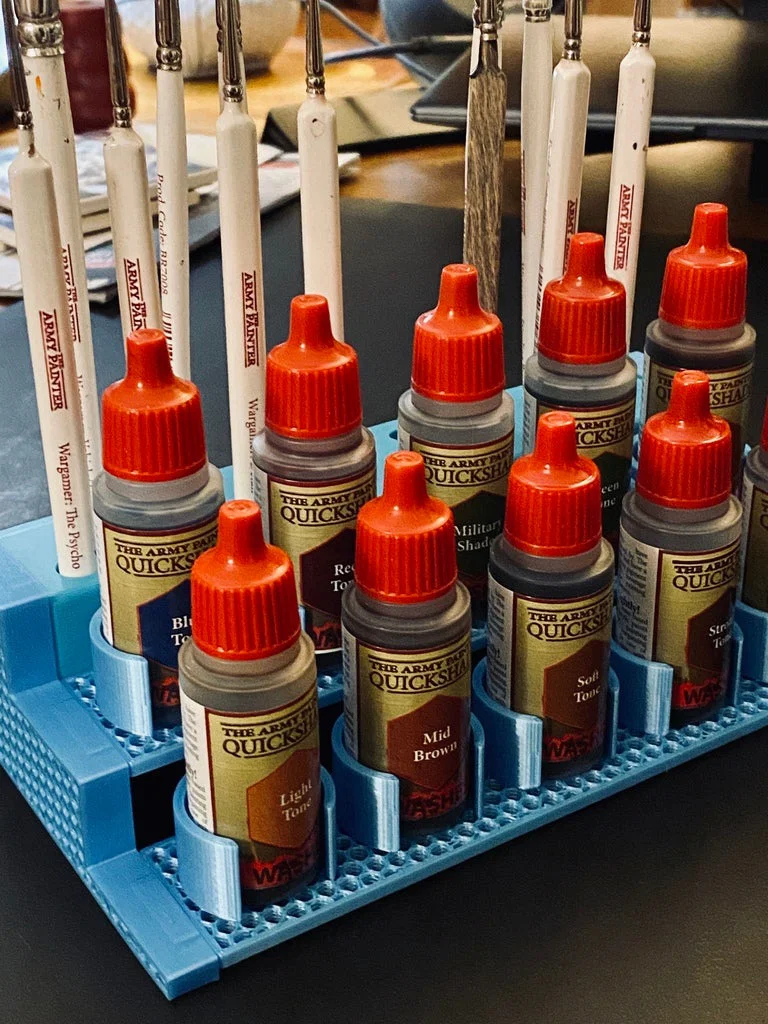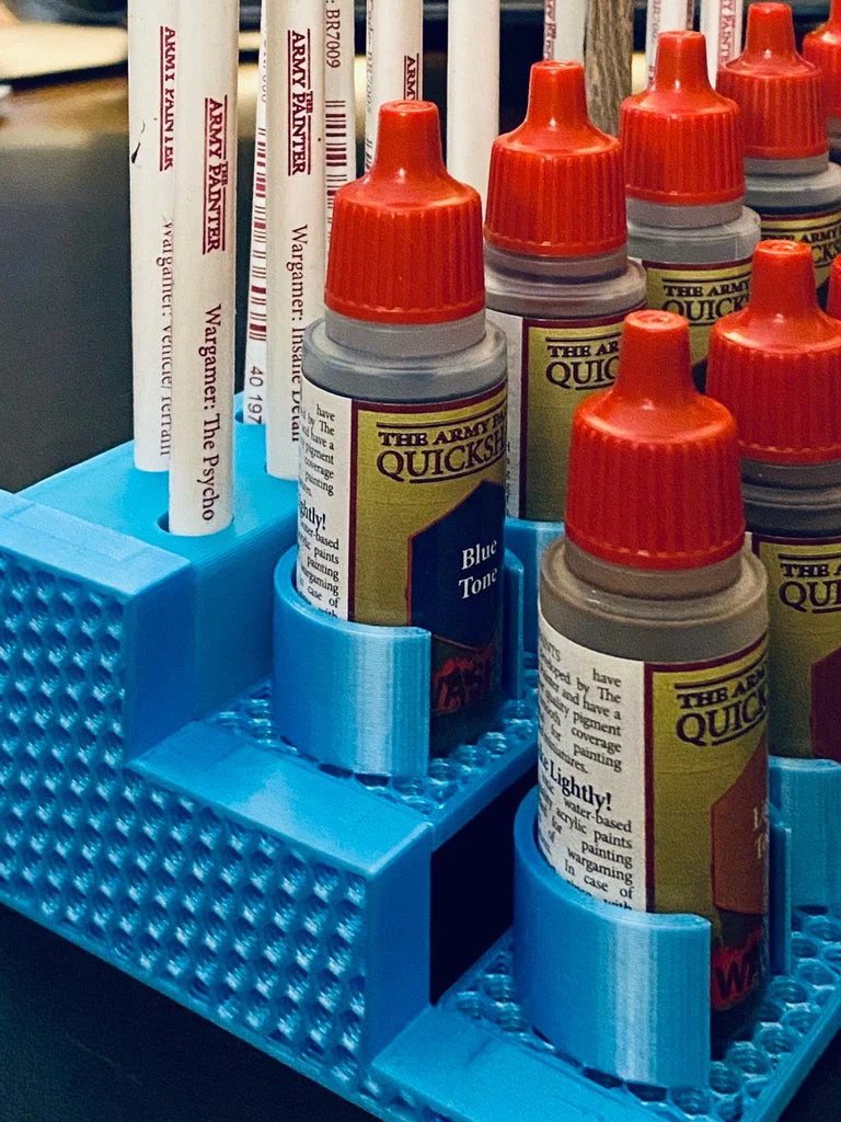 Ngoài ra, tôi còn thêm khay tùy chọn và giá cắm cọ, có 8 lỗ cho cọ Army Painter tay cầm tam giác và 8 lỗ cho tay cầm tròn.