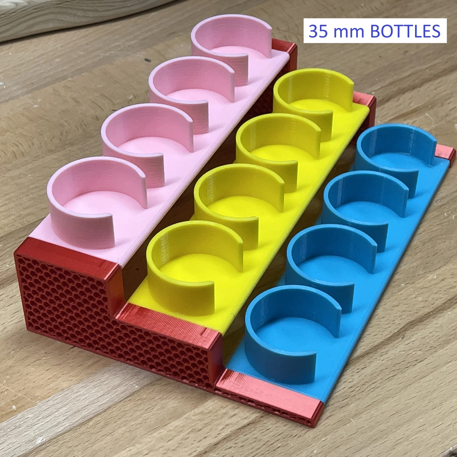 Cập nhật 14/4/2021: Đã thêm file STL cho lọ 35mm theo yêu cầu. LƯU Ý: Tôi chưa trực tiếp dùng loại lọ này nên dù đã kiểm tra lắp ráp, tôi chưa thử với lọ sơn thực tế.