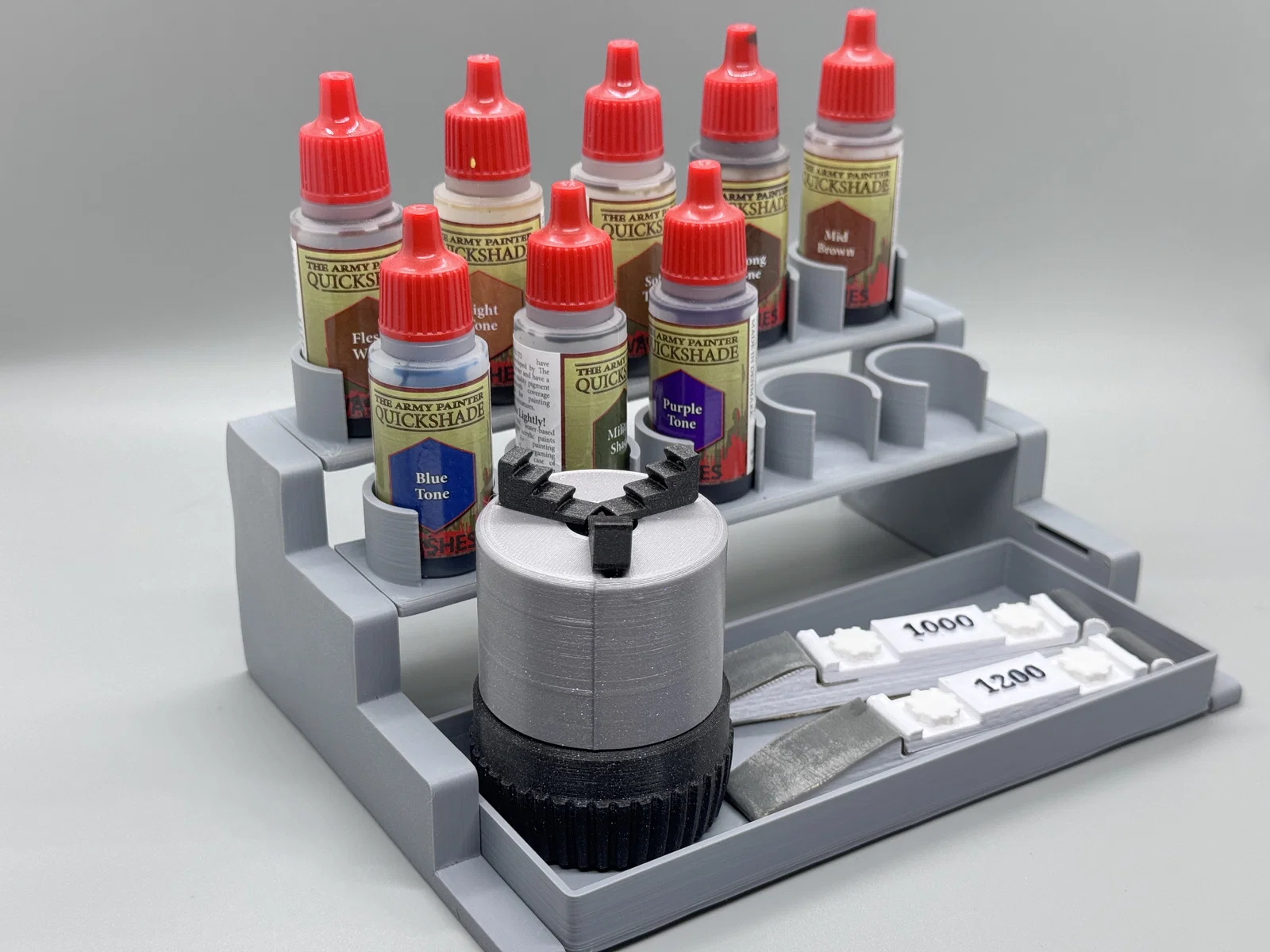 Hệ thống giá kệ lắp ghép linh hoạt cho lọ sơn 24.5mm (Vallejo/Army Painter) và 36mm (Tamiya). Thiết kế dạng module, có thể ghép nhiều tầng, tùy chọn thêm khay đựng và giá cắm cọ tiện lợi cho góc làm việc của bạn.