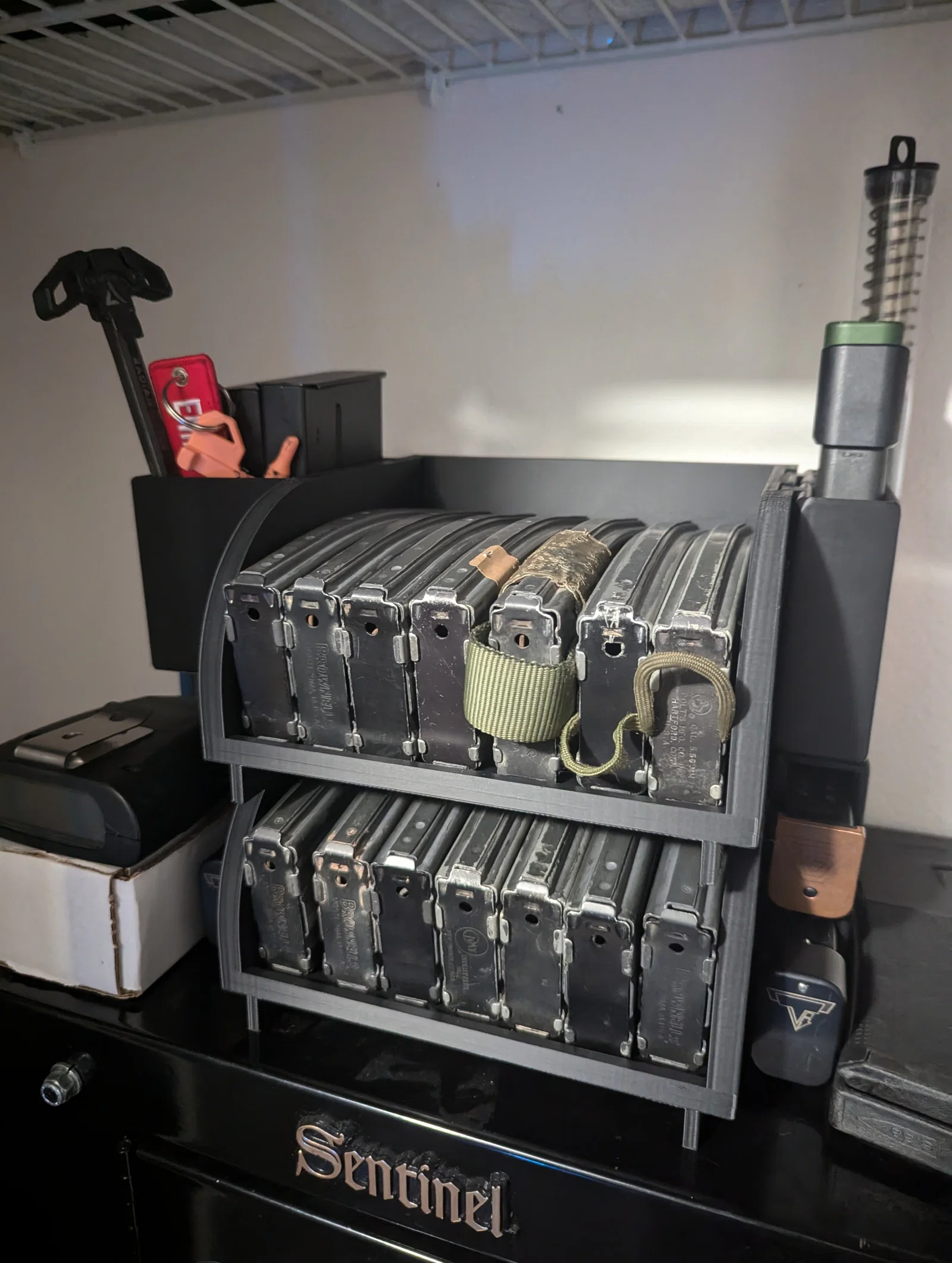 Khay đựng băng đạn AR-15 có khả năng xếp chồng thông minh với hệ thống khớp nối dạng đuôi én linh hoạt. Thiết kế hỗ trợ nhiều loại băng đạn như STANAG, PMAG, Glock và AICS, giúp bạn sắp xếp khu vực để đồ một cách gọn gàng và khoa học.