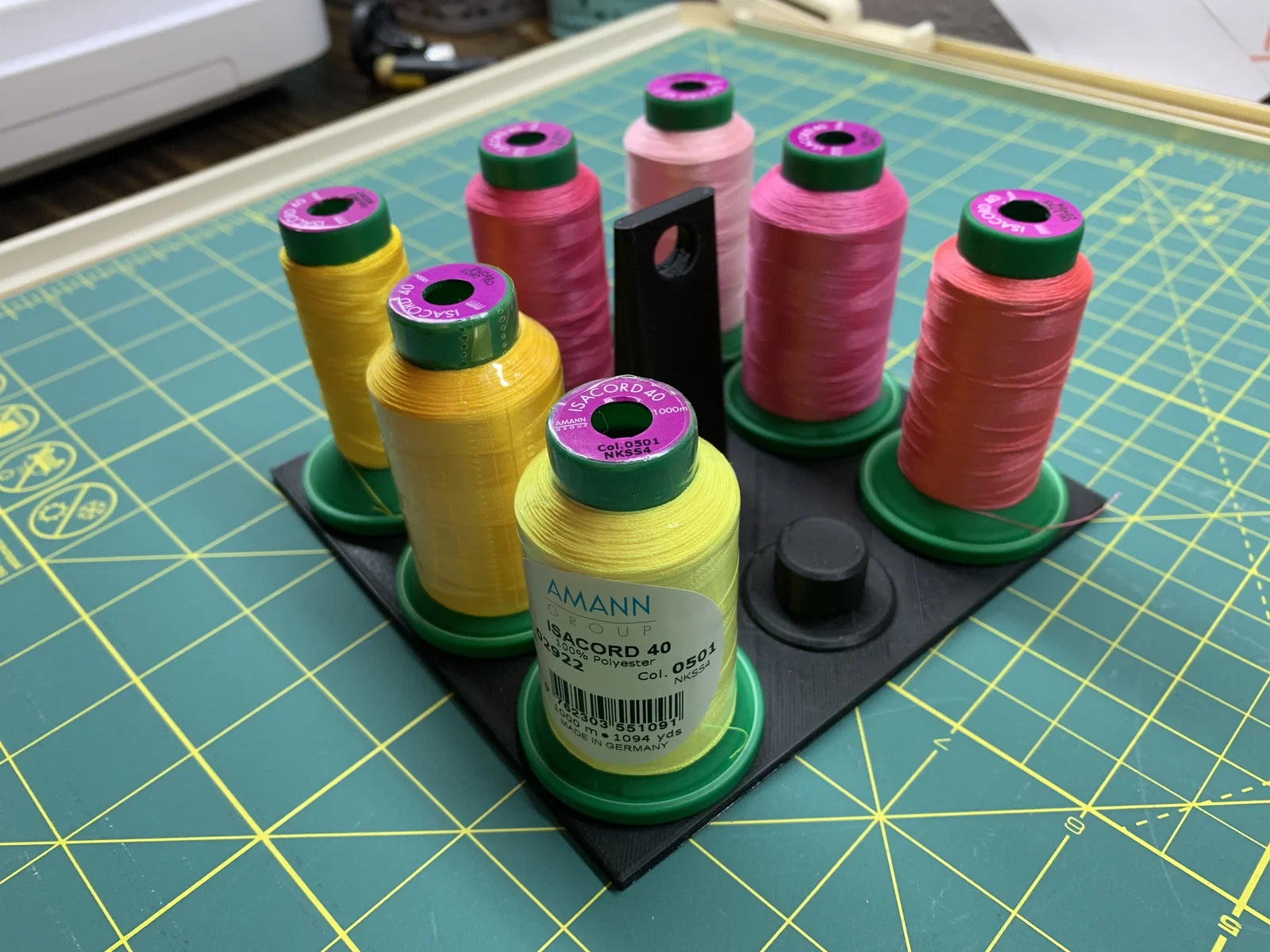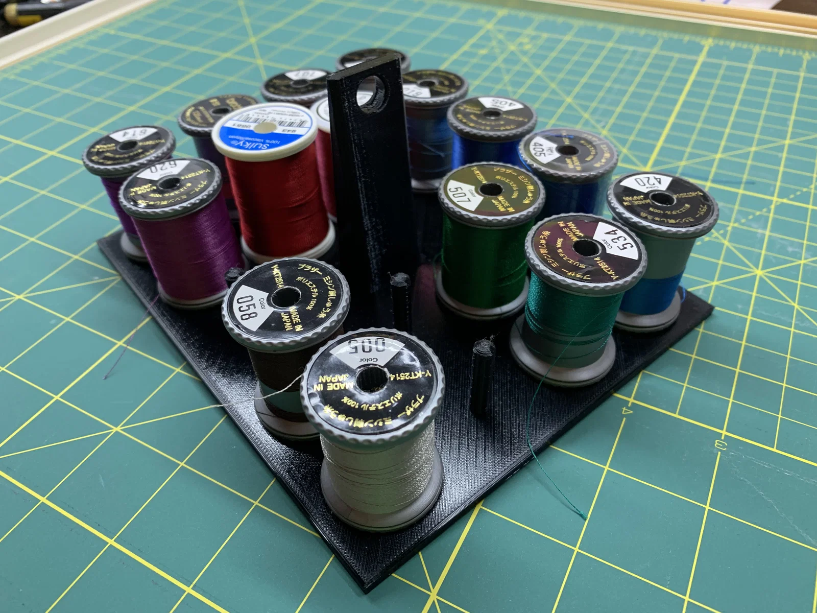 Mình đã thiết kế các loại giá đỡ cuộn chỉ để giúp bà xã sắp xếp ngăn kéo gọn gàng hơn. Bộ sản phẩm hỗ trợ nhiều kích thước cuộn khác nhau, bao gồm cả loại v-spool, giúp việc lấy chỉ ra khỏi ngăn kéo trở nên dễ dàng và thuận tiện hơn rất nhiều.