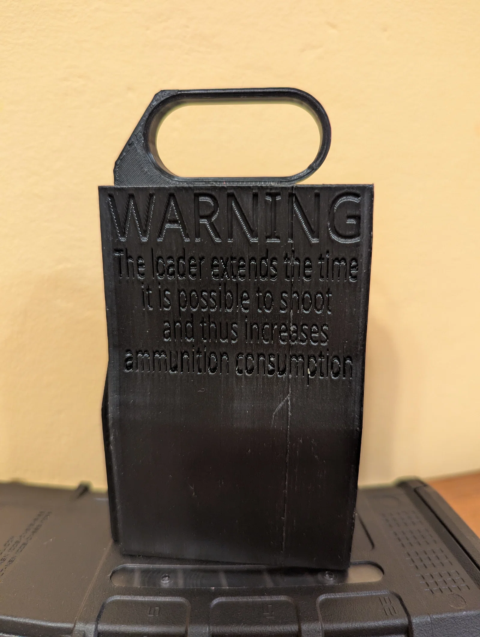 Điểm thú vị của mô hình này chính là dòng chữ cảnh báo hài hước được in nổi trực tiếp trên thân thiết bị: "WARNING: The loader extends the time it is possible to shoot and thus increases ammunition consumption" (Cảnh báo: Dụng cụ nạp đạn này làm kéo dài thời gian bắn và do đó làm tăng mức tiêu thụ đạn). Đây là một lời nhắc nhở hóm hỉnh về việc khi bạn nạp đạn nhanh hơn, bạn sẽ có xu hướng bắn nhiều hơn, điều mà mọi tay súng đều biết rõ nhưng đôi khi vẫn vô tình "quên mất".