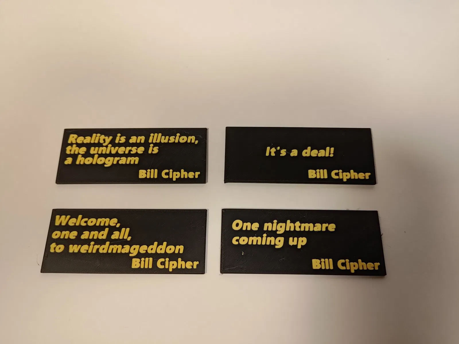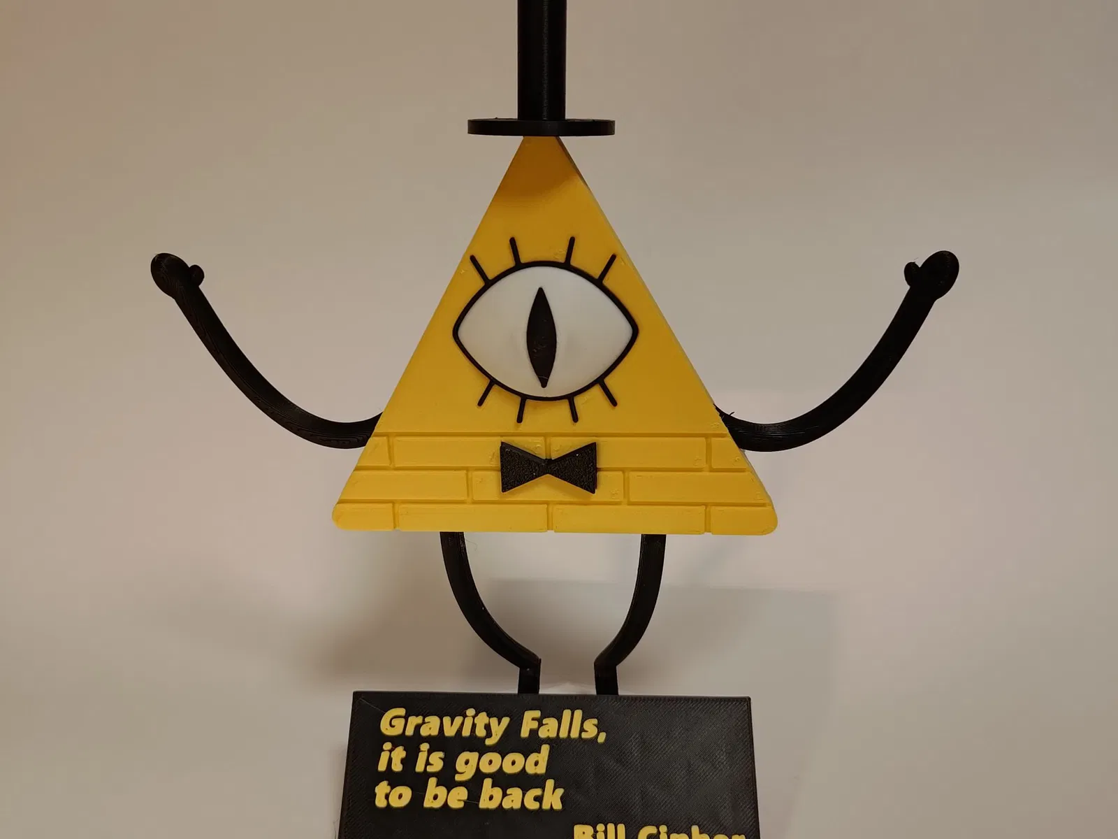 Tôi đã sử dụng Polymaker PolyTerra Savannah Yellow, Cotton White và Charcoal Black cho các bản in trong hình ảnh. Chúng có một lớp hoàn thiện mờ đẹp. Màu vàng không phải là màu vàng sáng, đầy đủ, nhưng nó có vẻ phát quang một cách kỳ lạ, điều này khá phù hợp với Bill Cipher. Rốt cuộc, anh ấy được cho là phát sáng.