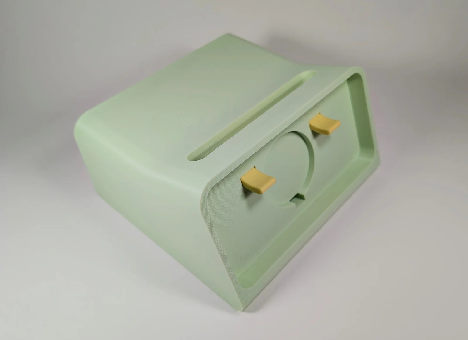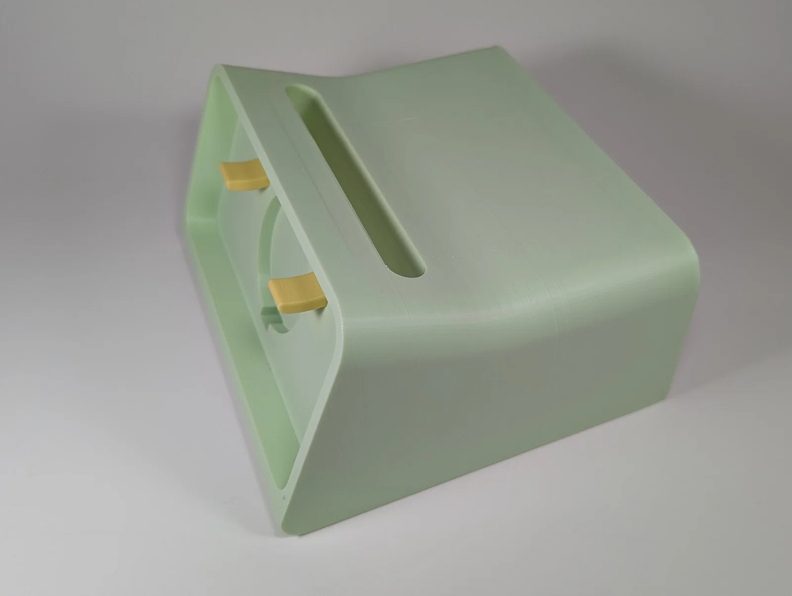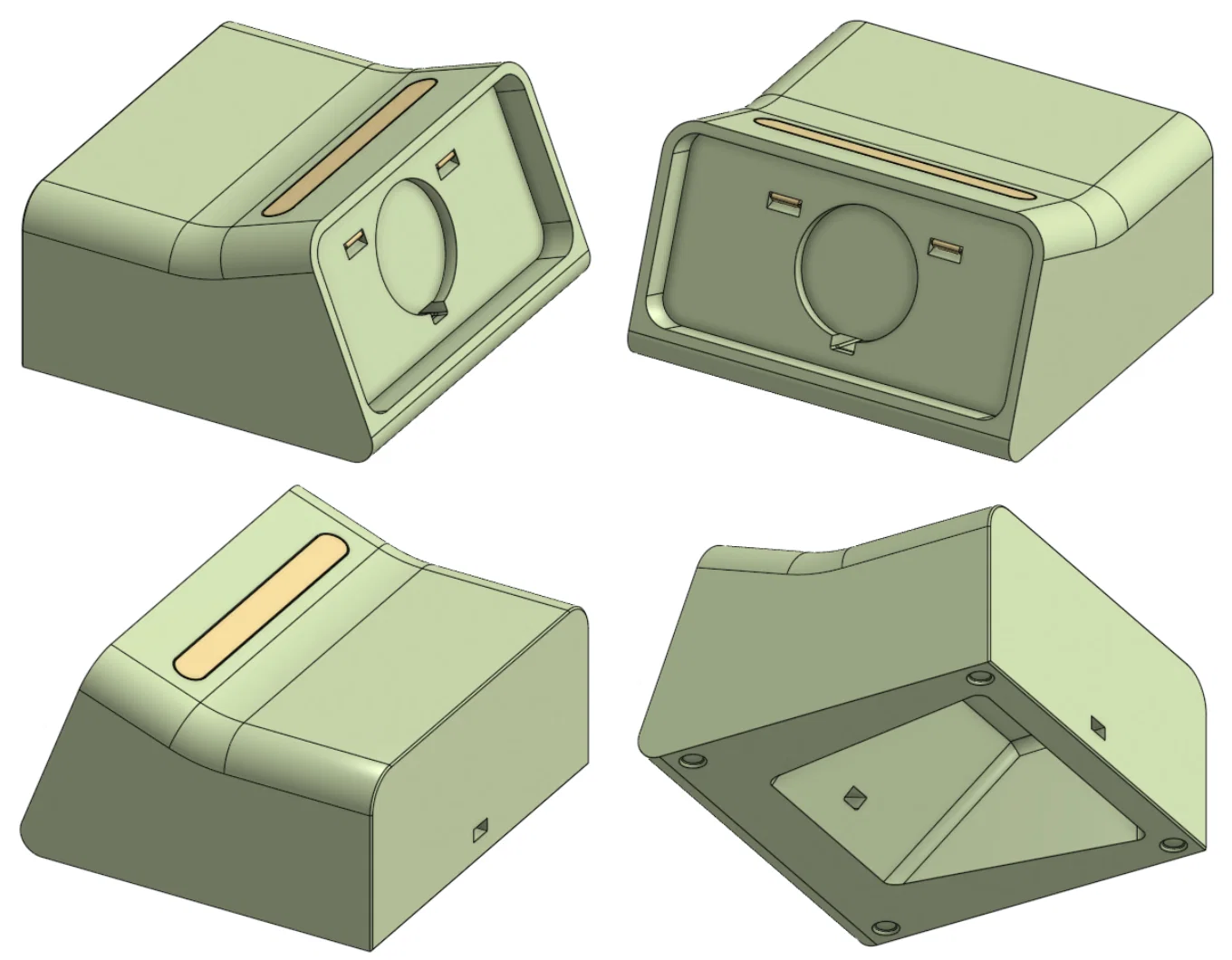 Cập nhật - 22/11/2024: Mở rộng khe đẩy để dễ thao tác hơn. Cập nhật file STL. Cập nhật - 11/11/2024: Đã in xong toàn bộ (trên Ender 3 V2, hơi chậm một chút) và thêm hình ảnh thực tế. Thanh đẩy trước đó hơi mỏng nên mình đã làm dày hơn. Cập nhật file Push Part mới. Cập nhật - 9/11/2024: Căn giữa lỗ gắn đế sạc. Làm khe đẩy sâu hơn để lấy điện thoại ra dễ dàng. Cập nhật - 8/11/2024: Thay đổi khe đẩy để không bị cao quá khi cắm máy. Thêm vát mép 0.8mm ở mặt đáy để giảm hiện tượng chân voi (elephant's foot). Nghiêng mặt trước từ 73 xuống 69 độ. Giảm chiều cao phần sau để trông gọn gàng giống thiết kế của Scott Yu Jan hơn. Cập nhật file STL và STEP cũ vào thư mục "Old Version (Bad Eject Slot)". Đang phát triển: Bản không dùng ốp sẽ sớm ra mắt. Sẽ thêm khoảng trống cho cụm camera cho máy dùng ốp hoặc không ốp.