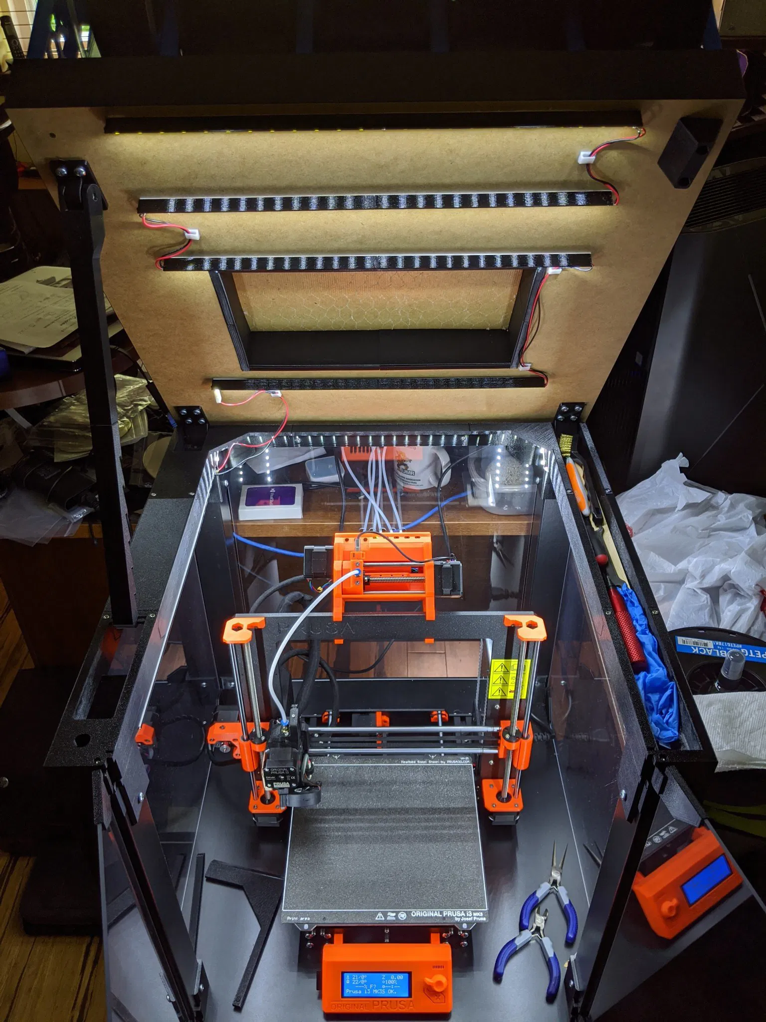 Tôi muốn thêm một số ánh sáng vào Enclosure IKEA Lack của mình và quyết định sử dụng một số dải LED từ Amazon. Tôi cũng muốn điều chỉnh chúng sao cho chúng hướng về phía máy in, ngay cả những cái được gắn ở mặt dưới của nắp khi nó mở. Những dải này có chân và ổ cắm ở đầu để giúp căn chỉnh chúng theo một đường thẳng. Tôi cũng có một phần mà tôi muốn giấu một số dây, vì vậy tôi đã thêm một kênh bên trong để quản lý dây. Có lẽ có cách tốt hơn để làm điều này, nhưng tôi đã tạo một mô hình cho mỗi chiều dài của dải từ 1 cm đến 20 cm để chúng có thể dễ dàng được kết hợp và phù hợp với chiều dài mong muốn tổng thể. Chúng nên có khả năng xử lý các dải LED rộng tới 14mm. Có nhiều tùy chọn ở đó để chọn từ. Cuối cùng tôi đã sử dụng những đèn LED này từ Amazon cho enclosure của mình và còn thừa vài feet khi tôi hoàn thành. https://www.amazon.com/gp/product/B07PLZ385X/ Tôi cũng đã tạo một grommet dây để truyền sạch sẽ cáp nguồn qua đáy của Enclosure Lack của tôi. Đầu của phích cắm nguồn dải LED rất chặt và cần một chút lực để đẩy nó qua grommet. Xem bản in này để biết chi tiết < ### Hướng dẫn in Đây là các cài đặt tôi đã sử dụng cho các bản in của mình. Độ phân giải: 0.20mm Chất lượng Vật liệu: PETG Hỗ trợ: Không Đổ đầy: 15% Brim: Không