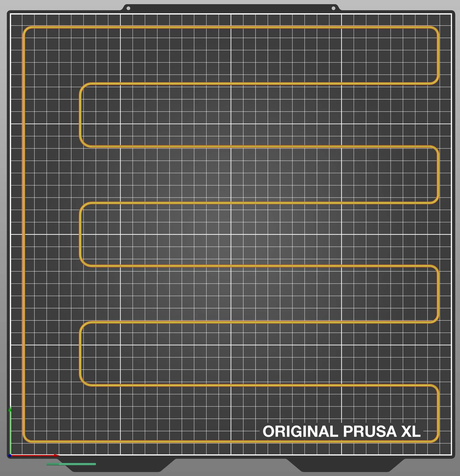 Mẫu in gồm các vòng lặp đơn cao 0.2mm phủ khắp bàn in Prusa XL, giúp anh em kiểm tra độ chuẩn của lớp đầu tiên nhanh chóng với thời gian in chỉ từ 8 đến 14 phút tùy theo kích thước vòng lặp.