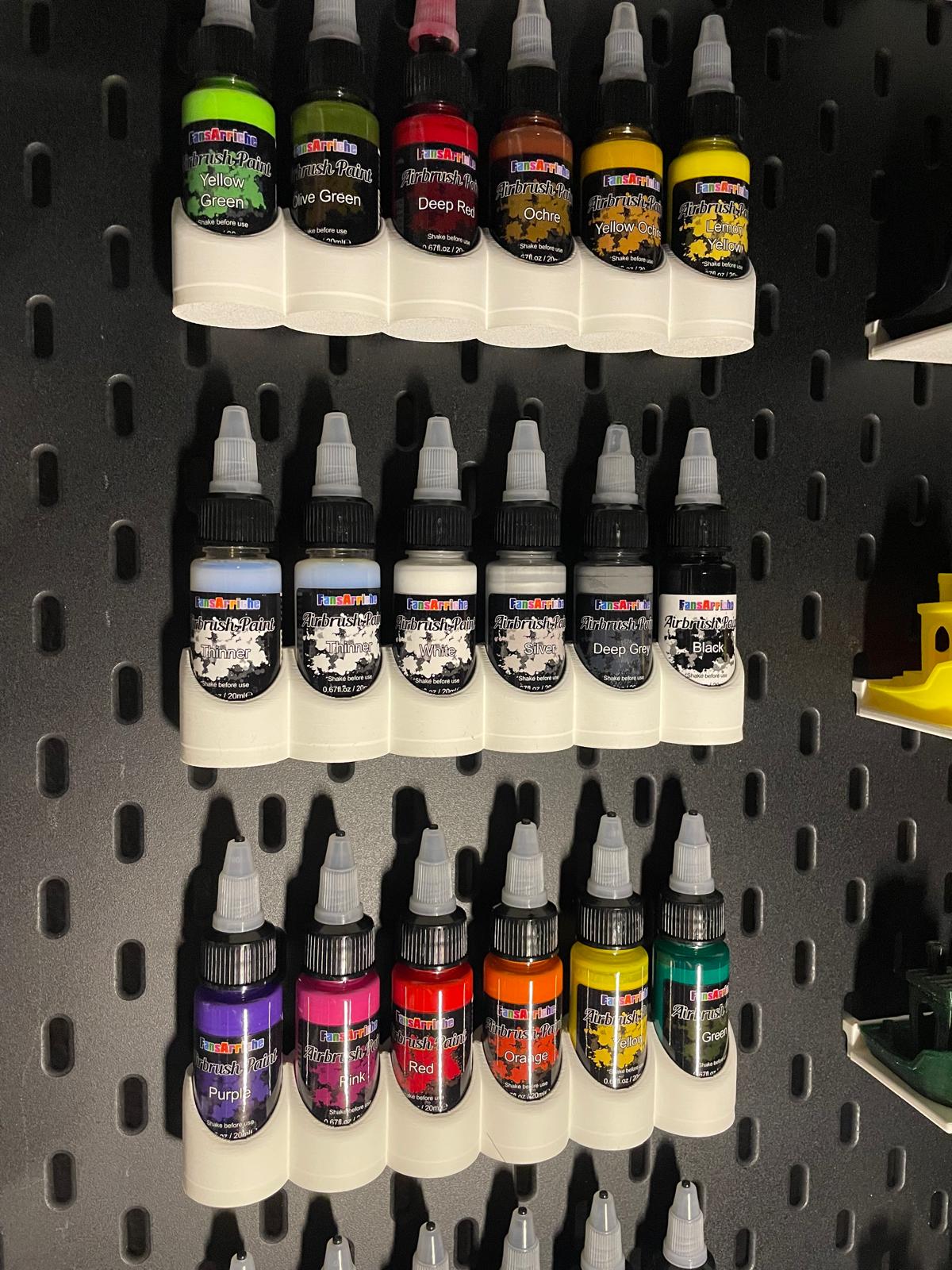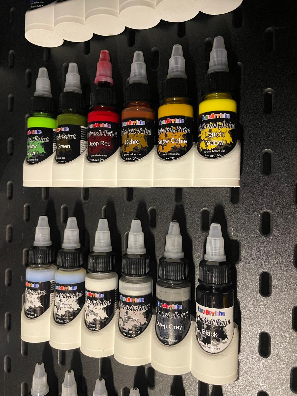 Một chiếc giá đỡ tiện dụng được thiết kế để đựng các chai sơn airbrush, tương thích hoàn hảo với hệ thống bảng treo IKEA Skadis. Mẫu này gắn vào bảng Skadis rất dễ dàng, mang lại giải pháp gọn gàng và chuyên nghiệp giúp bạn sắp xếp màu sơn ngăn nắp ngay trong tầm tay. Sản phẩm này cực kỳ phù hợp cho các nghệ sĩ và những người chơi mô hình đang tìm cách tối ưu hóa không gian làm việc của mình.