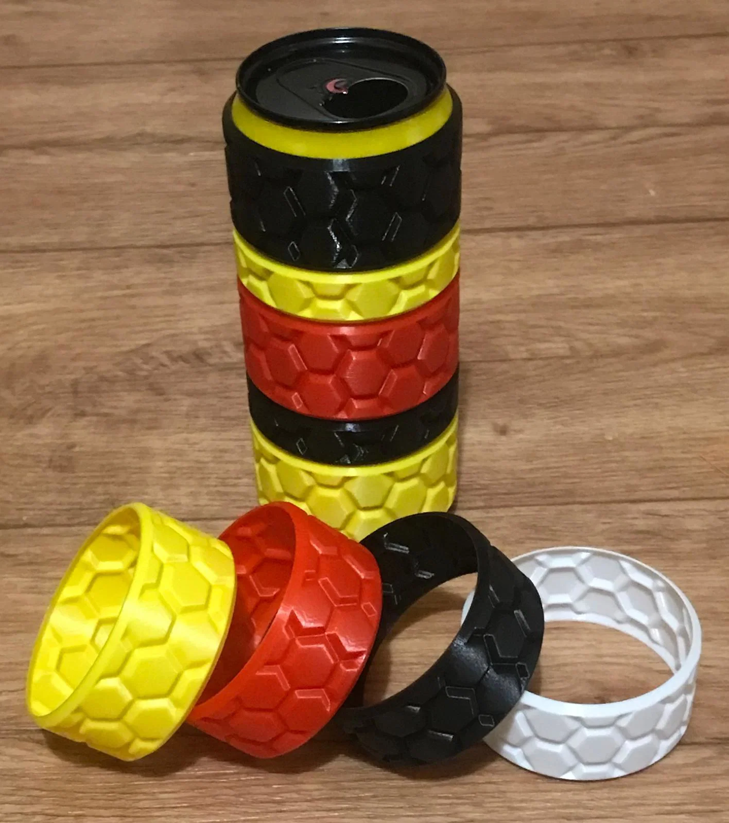 - Sáng tạo: Bạn có thể in nhiều vòng với các màu khác nhau để lồng vào nhau, tạo nên hiệu ứng thị giác ấn tượng hoặc phân biệt lon nước dễ dàng.