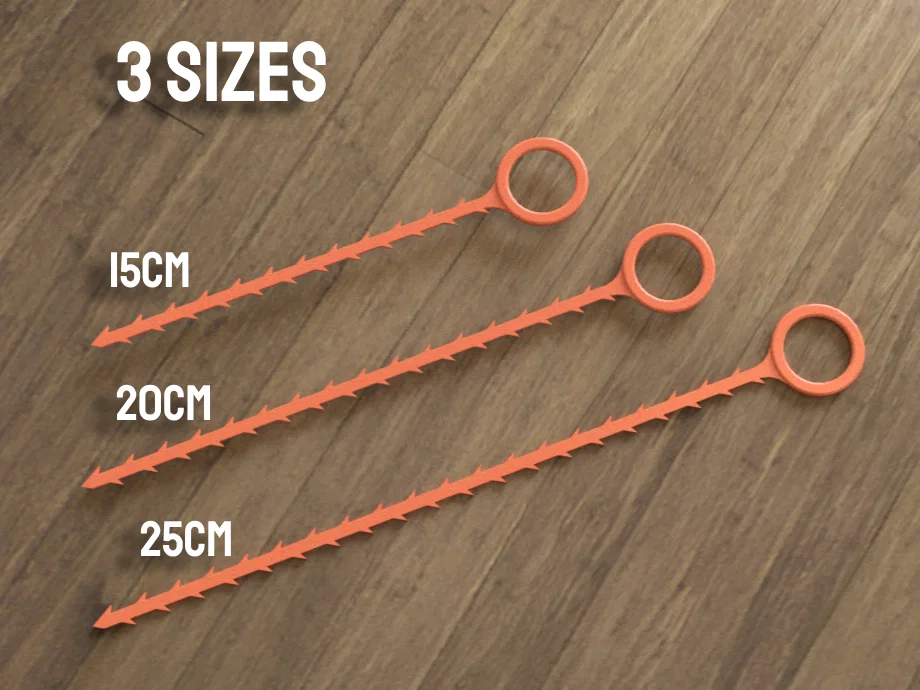 Dụng cụ thông cống đa năng với ba kích thước chiều dài—15cm, 20cm và 25cm—được thiết kế để loại bỏ hiệu quả tóc và các loại cặn bẩn cứng đầu bám trong đường ống thoát nước.