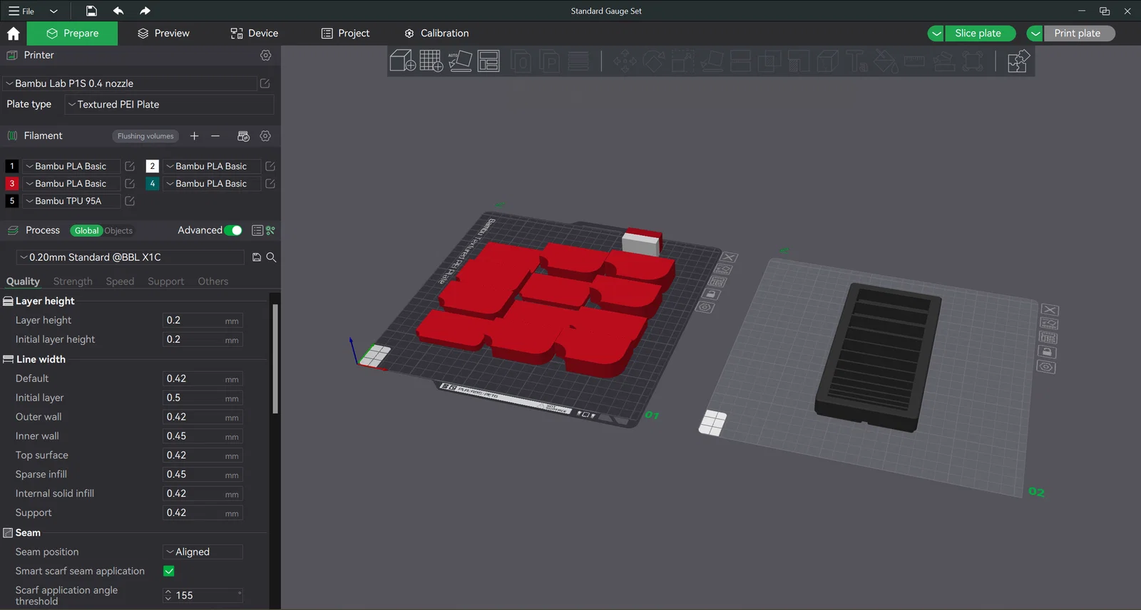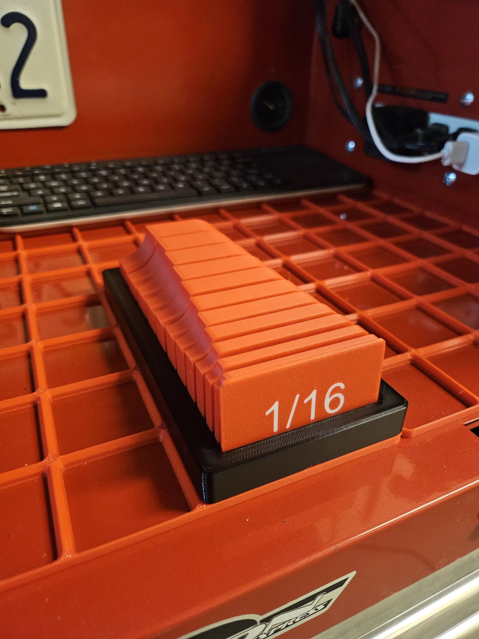 Bộ thước đo độ dày/bán kính tiêu chuẩn gồm 12 món từ 1/16 đến 3/4 inch kèm đế Gridfinity 2x4. Mỗi miếng thước đều có thể dùng để đo độ dày, đồng thời tích hợp cả bo góc lõm và lồi. Mọi chi tiết đã được đo đạc chính xác bằng thước kẹp điện tử, tuy nhiên độ chính xác cuối cùng vẫn sẽ phụ thuộc vào cách bạn tinh chỉnh máy in. Các miếng thước có kích thước 1.5in x 2.5in kèm độ dày tương ứng. Thiết kế tối ưu cho in nhiều màu với hệ thống AMS. Được in bằng nhựa PLA trên máy Bambu P1S với chiều cao lớp in 0.2mm tiêu chuẩn trong Bambu Studio. Đế Gridfinity có các lỗ chờ sẵn cho nam châm 6mm x 4mm nếu bạn muốn sử dụng thêm.
