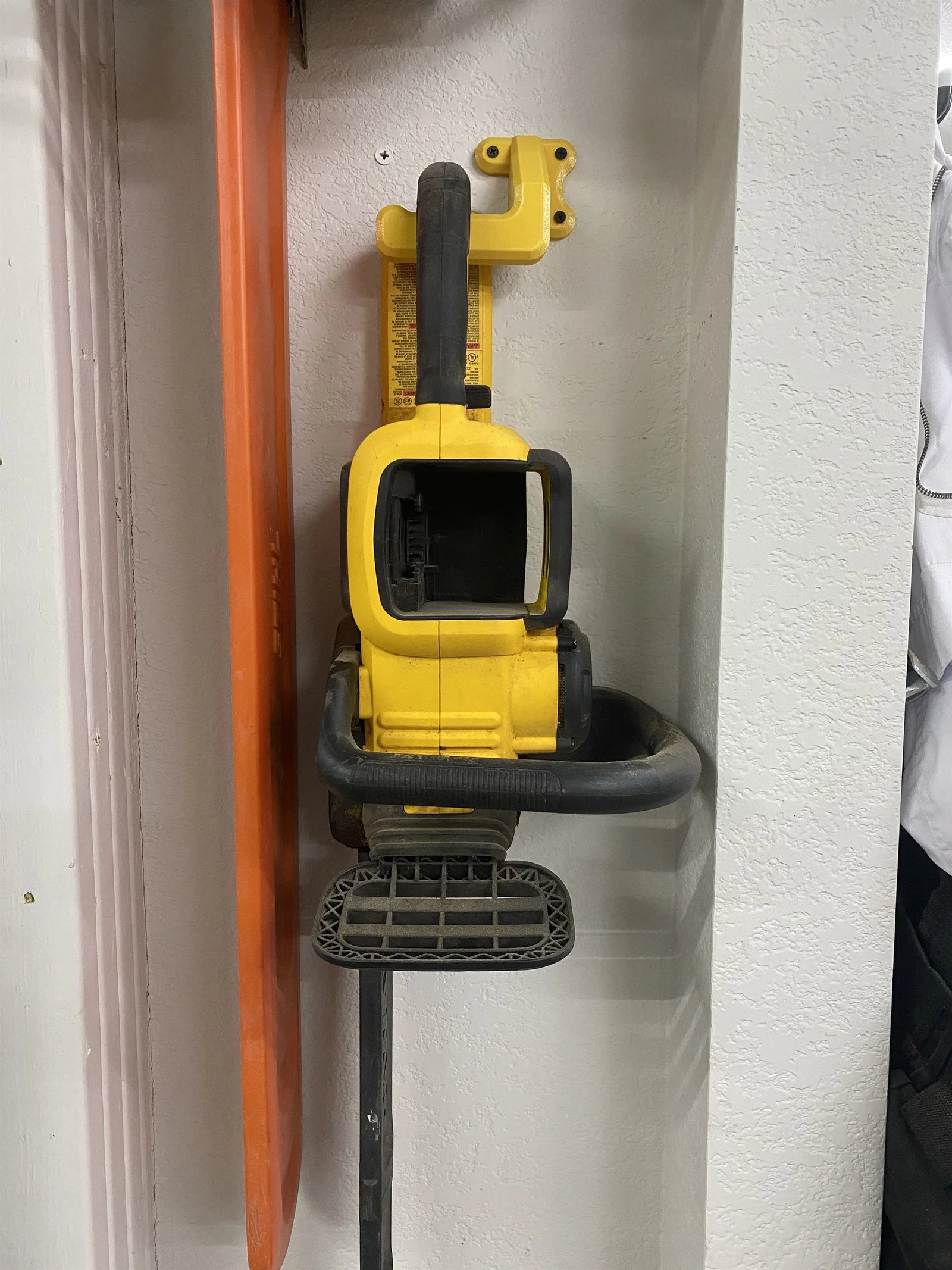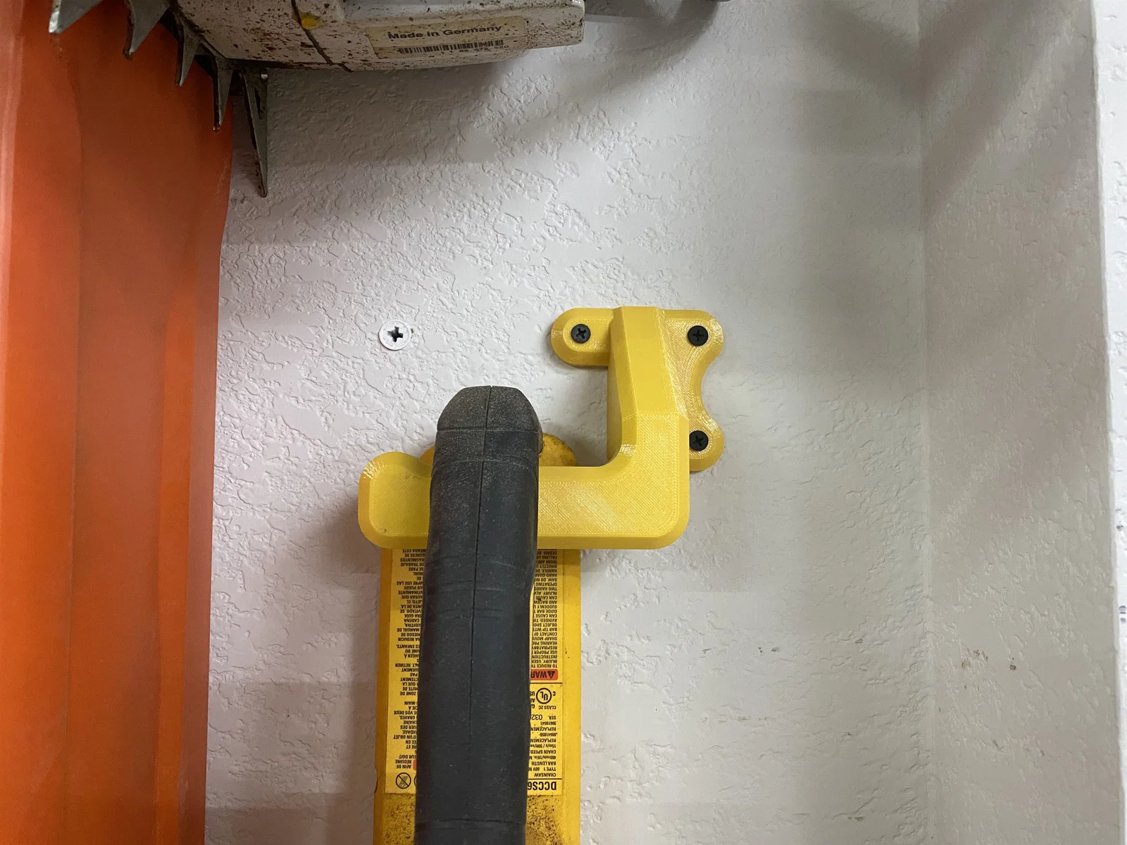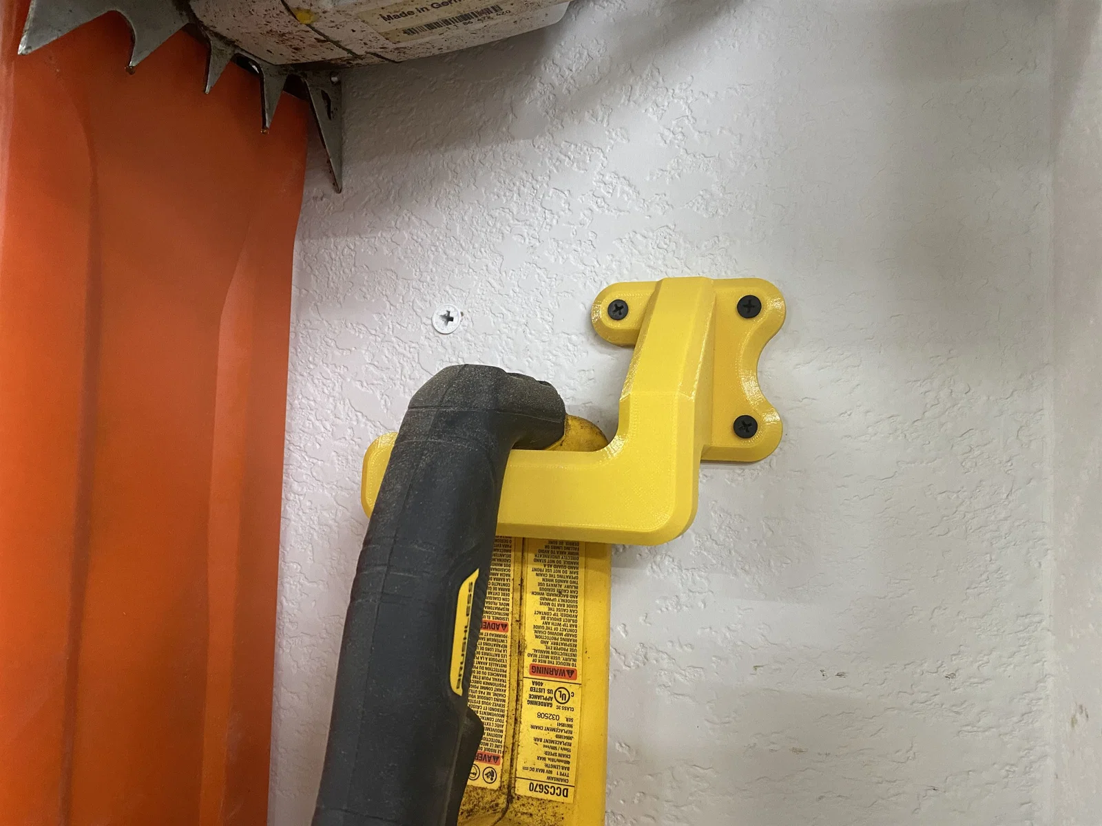 Giá treo tường dạng móc dành cho các loại máy cưa xích từ nhỏ đến trung bình. Mình đang dùng nó cho chiếc máy cưa xích dùng pin Dewalt Flexvolt 16".