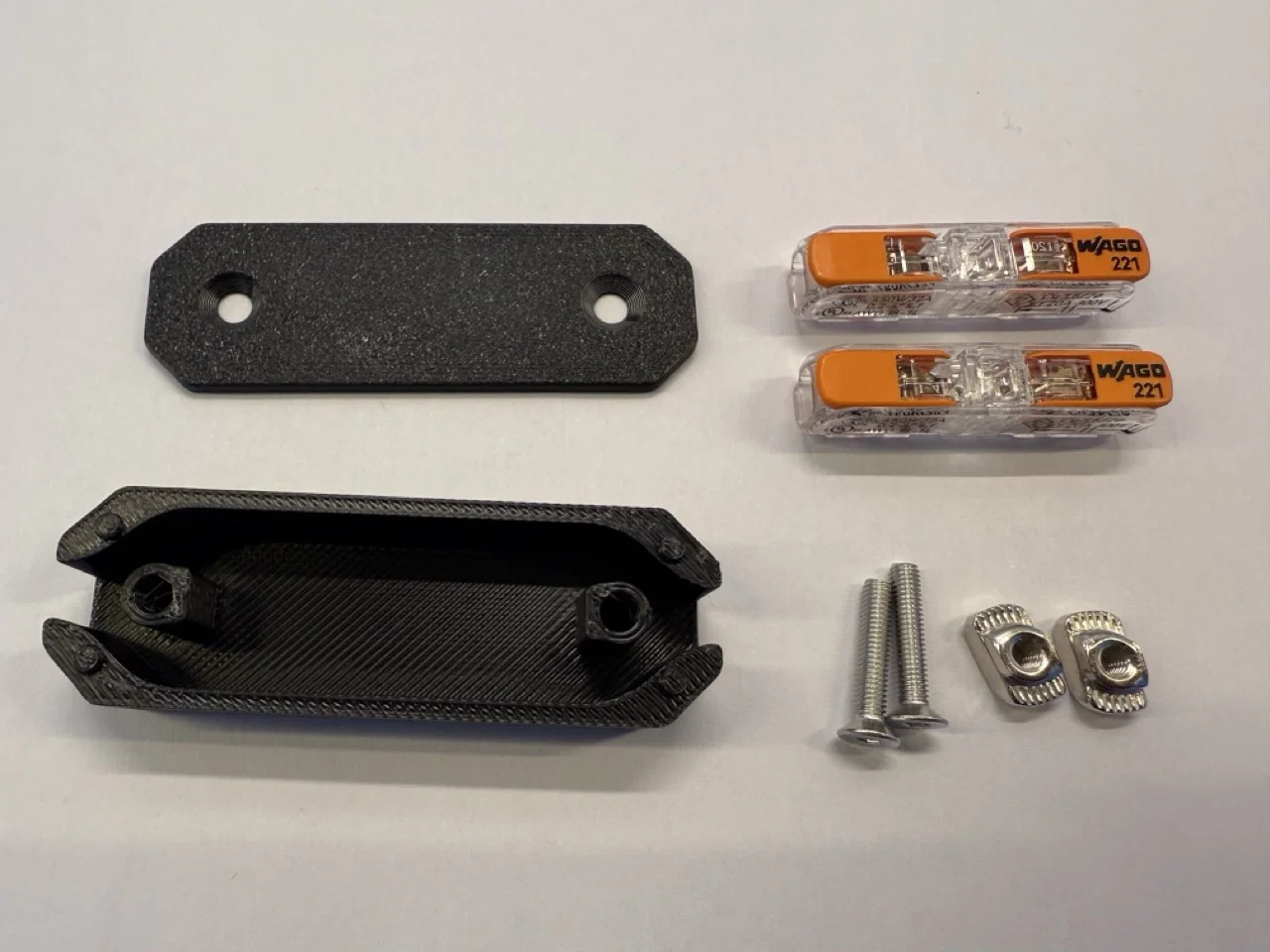 Cái vỏ bảo vệ đơn giản này giúp bạn gắn Wago 221-2411 lên thanh nhôm định hình 2020 (hoặc 3030) một cách gọn gàng và đẹp mắt. Không cần thiết lập máy in đặc biệt nào, nhưng mình khuyến khích dùng nhựa ABS hoặc ASA, nhất là khi bạn dùng trong môi trường buồng in nhiệt độ cao. BoM (Danh sách linh kiện): 1x đáy vỏ (đã in) 1x nắp vỏ (đã in) 2x ốc vít đầu bằng M3x16 2x đai ốc M3