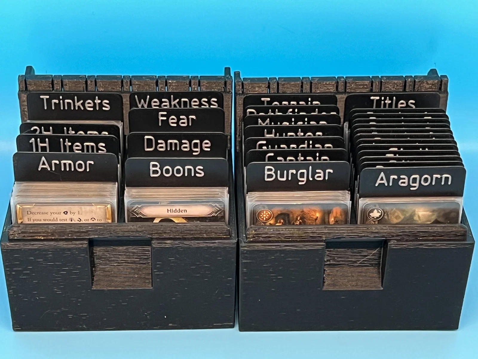 Bộ thẻ phân loại giúp sắp xếp gọn gàng các quân bài trong game Lord of the Rings: Journeys in Middle Earth và các bản mở rộng. Thiết kế tương thích với thẻ có bọc bảo vệ, có sẵn file 3MF để in màu và file Fusion 360 tùy chỉnh.