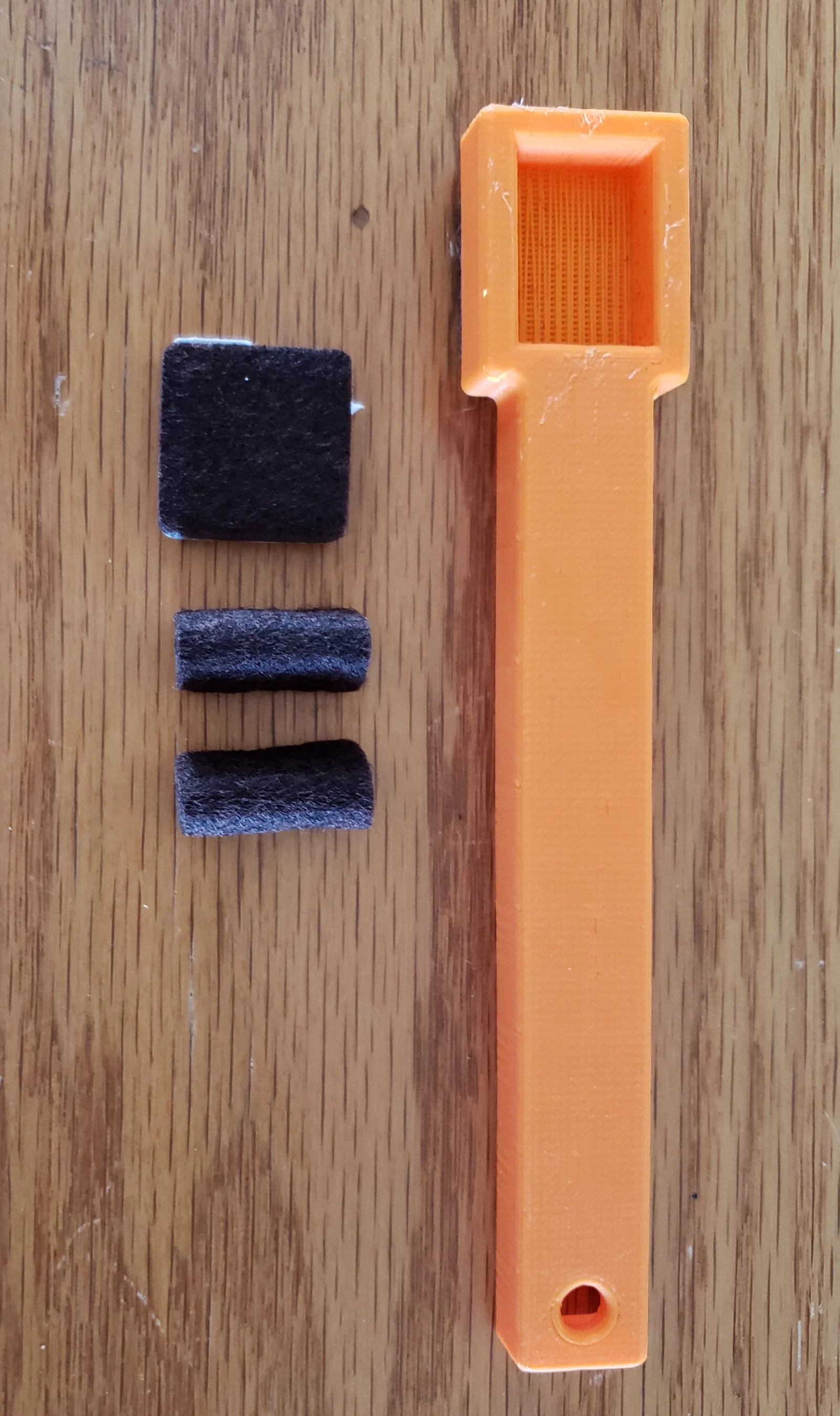 Ý tưởng này xuất phát từ một buổi Maker Faire khi anh ấy nói về chiếc bàn chải nozzle có được tại MRRF. Anh ấy khẳng định chất liệu của chiếc bàn chải đó là xịn nhất. Nó làm mình nhớ đến mấy miếng nỉ lót đồ thường thấy khi thuê xe tải vận chuyển. Từ đó, mình bắt đầu săn lùng thứ gì đó để tạo ra chiếc bàn chải nozzle tuyệt đỉnh. Mình thấy trên Amazon có bán mấy miếng nỉ đó nhưng giá khá chát và số lượng quá nhiều so với nhu cầu, mình đâu cần tới 1000 cái làm gì. Cuối cùng mình chọn loại miếng nỉ này và nó thực sự hiệu quả.