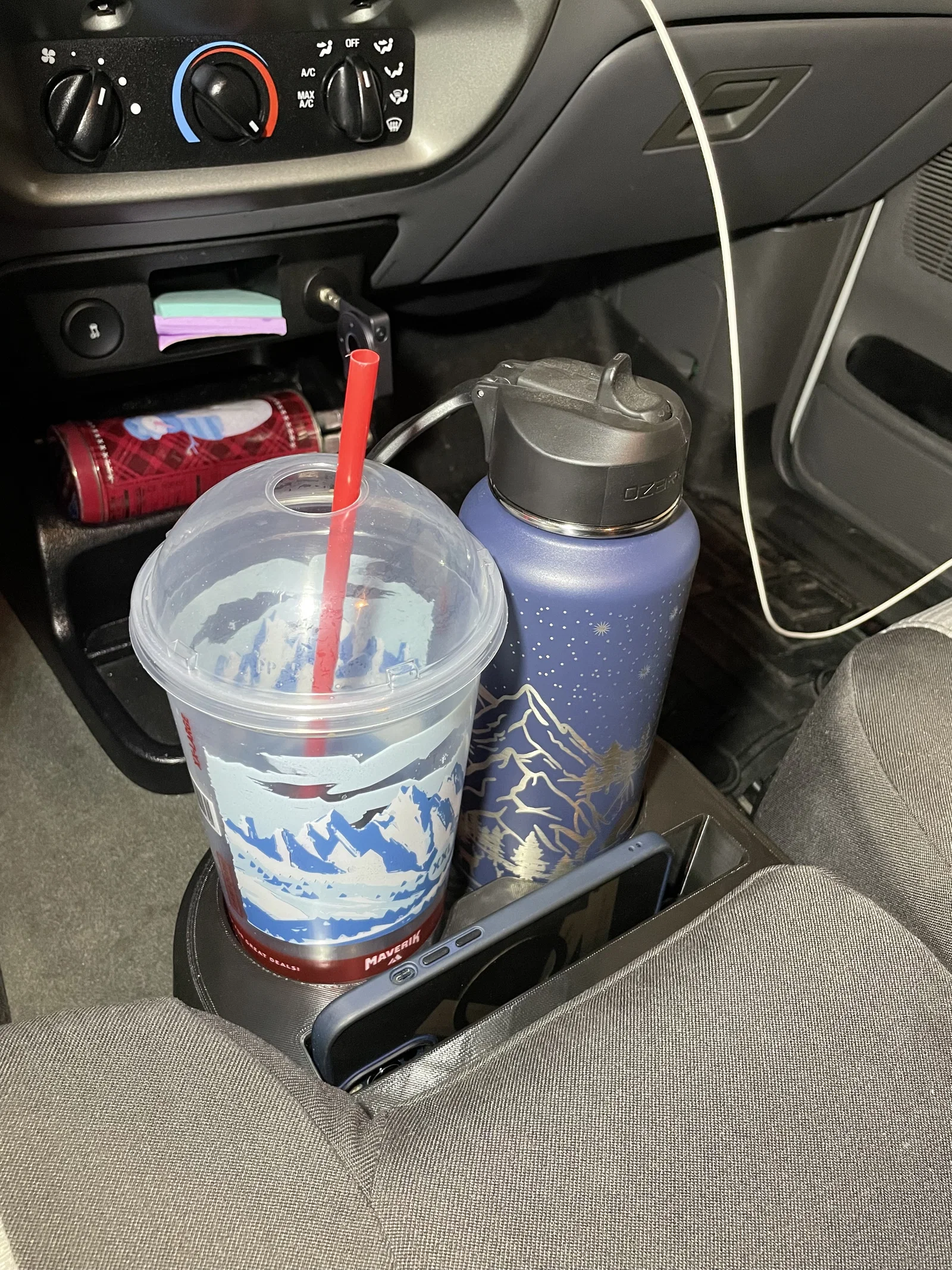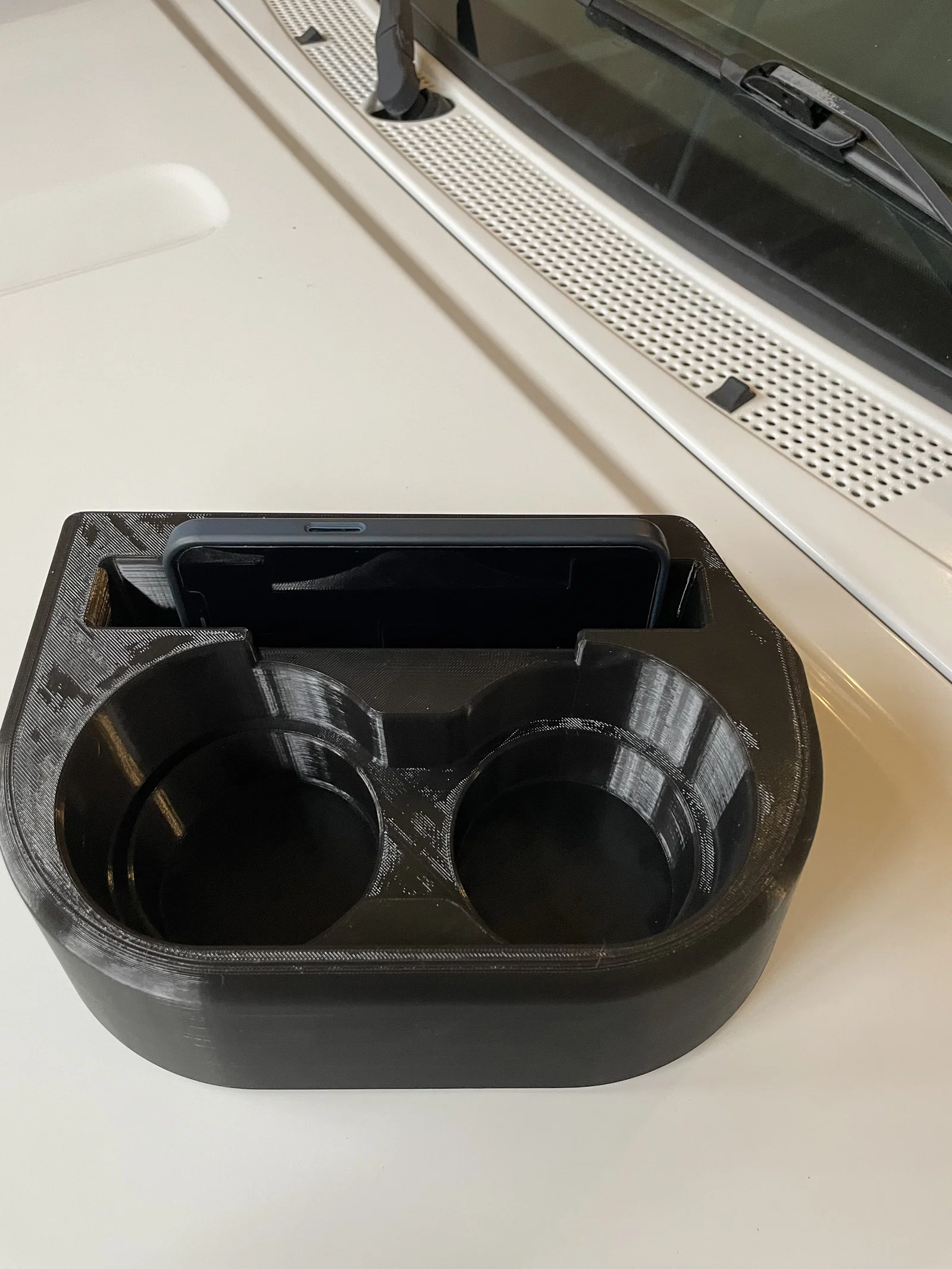 Đây là thiết kế khay đựng cốc lớn hơn so với khay zin trên dòng xe Ford Ranger đời thứ 3 (phiên bản ghế 60/40), vốn dĩ mọi người đều thấy quá nhỏ. Mình cũng đã bổ sung thêm một ngăn chứa đồ phụ để anh em có thể bỏ điện thoại hoặc ví tiền.