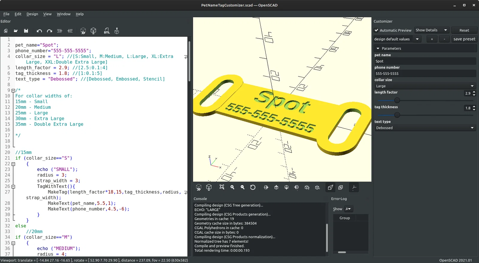 Đừng lo lắng, bạn không cần phải học viết script hay học CAD đâu! Chỉ cần mở file .scad và dùng tính năng Customizer để tạo file .stl. Cửa sổ Customizer sẽ hiện ra ở phía bên phải sau khi bạn mở file PetNameTagCustomizer.scad bằng OpenSCAD. Nếu không thấy, hãy nhấp vào “Window” ở trên thanh công cụ rồi chọn “Customizer” trong menu thả xuống. Nhấp vào tab “Parameters” để xem tất cả các giá trị bạn có thể điều chỉnh. Hãy nhập tên thú cưng, số điện thoại của bạn, rồi chọn Size (kích thước) và Text Type (kiểu chữ) mà bạn muốn. Sau đó điều chỉnh Length Factor (hệ số chiều dài) và Tag Thickness (độ dày thẻ) theo ý thích, rồi nhấn F6 để render và nhấn F7 để xuất file .stl.