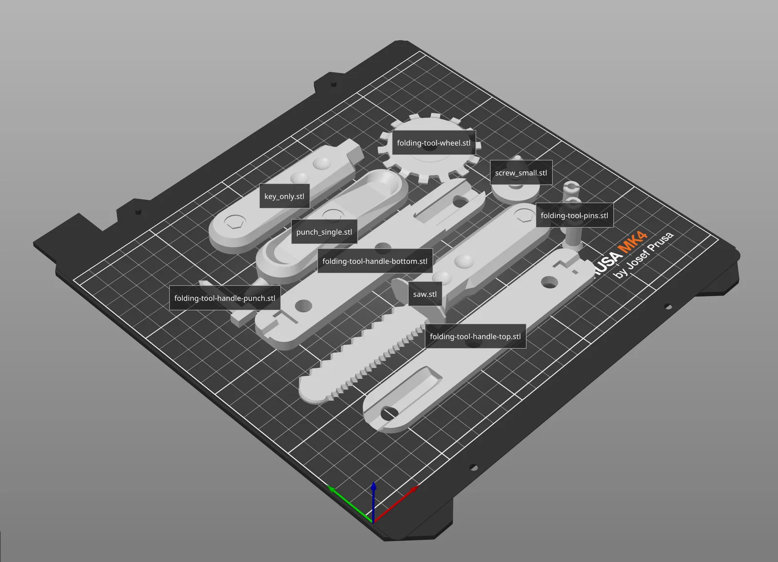 Bộ này là sự kết hợp của nhiều bản remix (bao gồm cả bản cải tiến của mình - đã bỏ một đầu của cái dùi đục, dù trong ảnh chưa cập nhật) cho các món như dao cắt bìa, dùi đục, chìa vặn và ốc vít. Đồng thời mình cũng tích hợp thêm một chuỗi các bản remix khác cho dụng cụ hỗ trợ gấp nếp.
