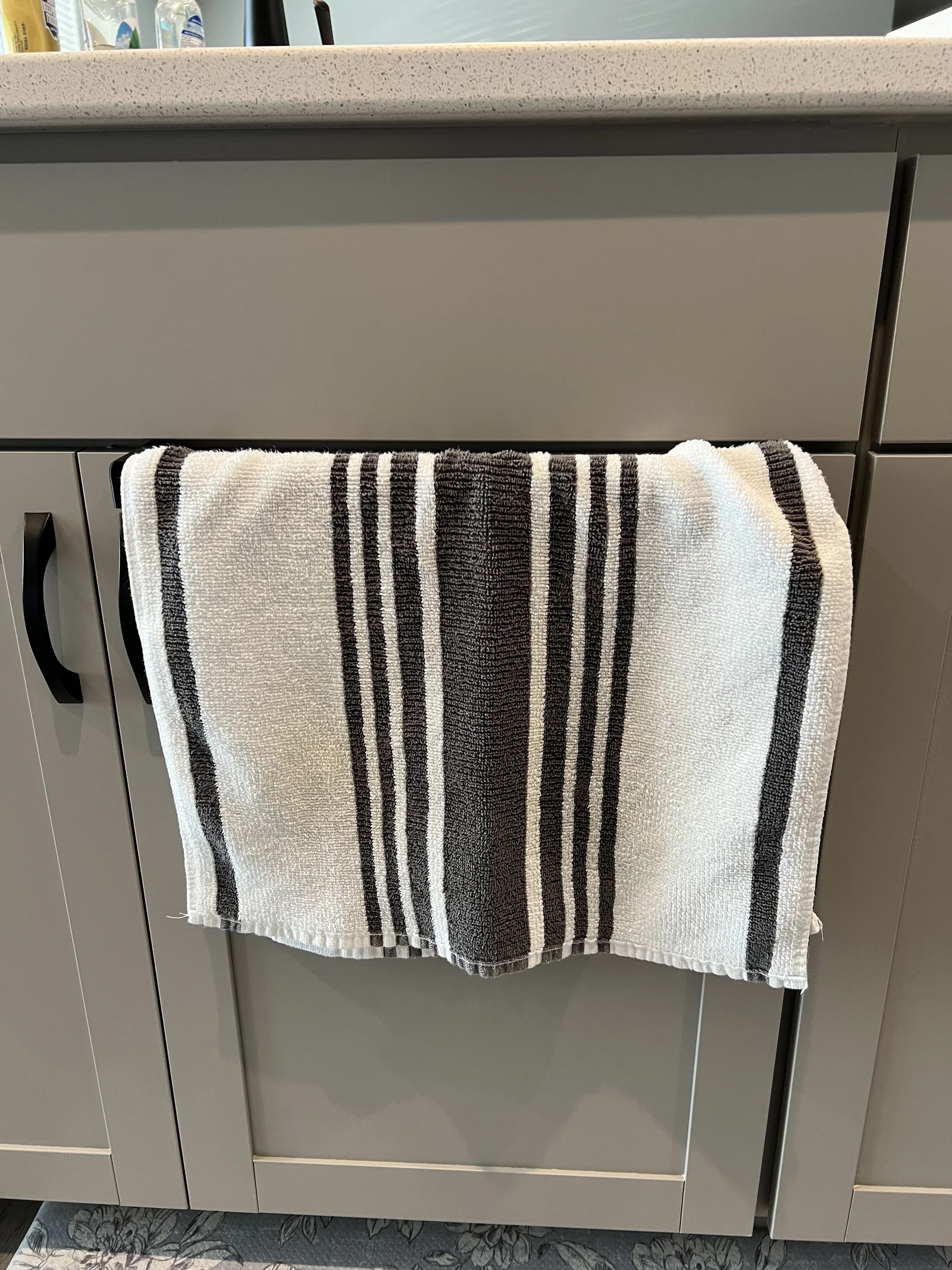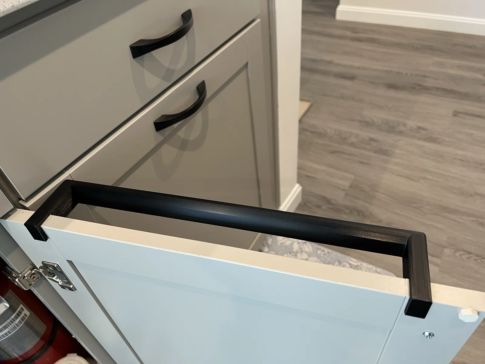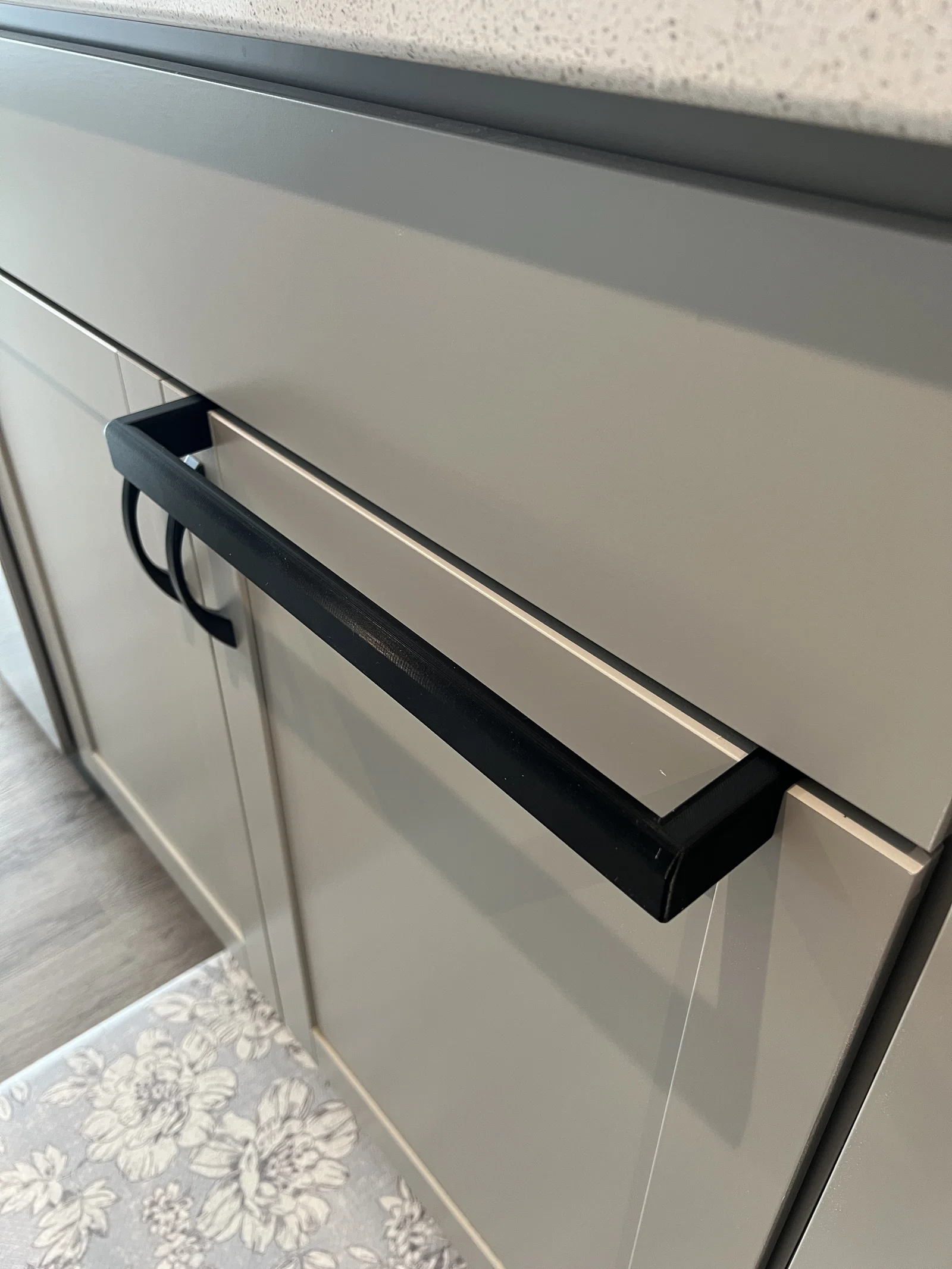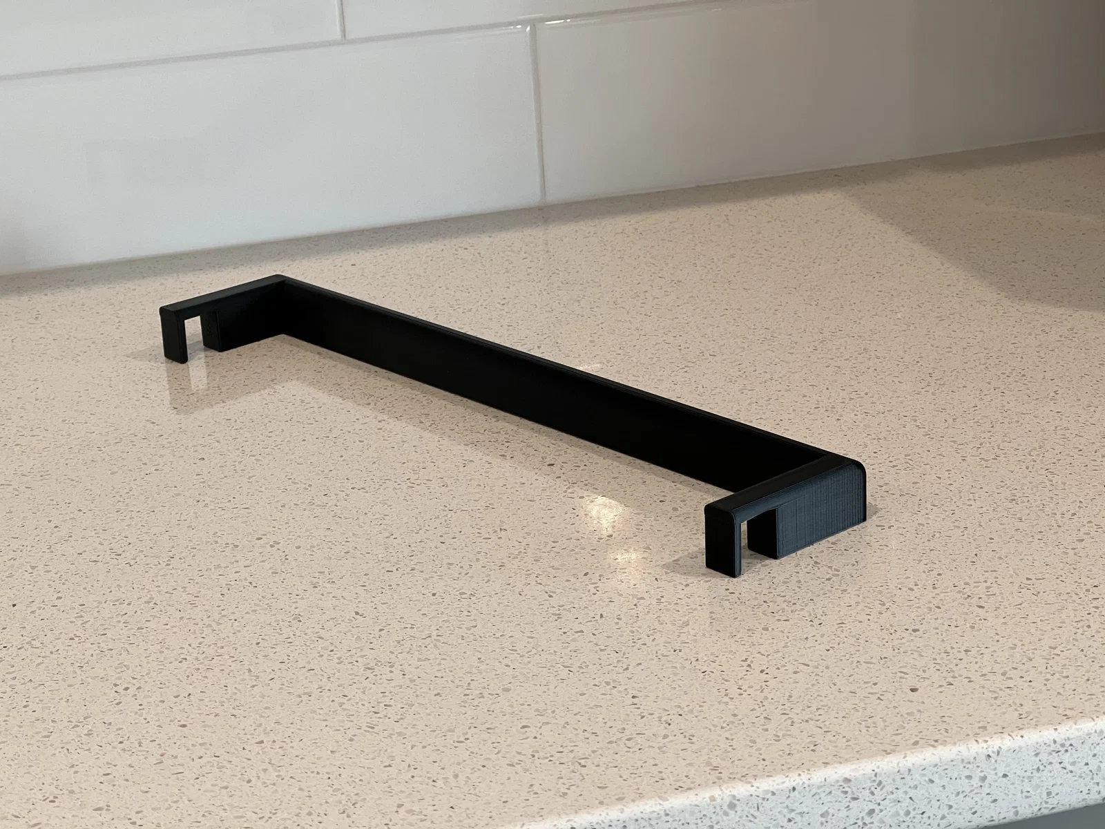 Một chiếc thanh treo khăn được thiết kế để móc trực tiếp lên cửa tủ bếp hoặc tủ quần áo. Chiều dài tổng cộng của thanh tính từ đầu này sang đầu kia là 370mm. Tôi có đính kèm file CAD nếu bạn muốn tùy chỉnh lại độ rộng cho vừa vặn với nhu cầu sử dụng.