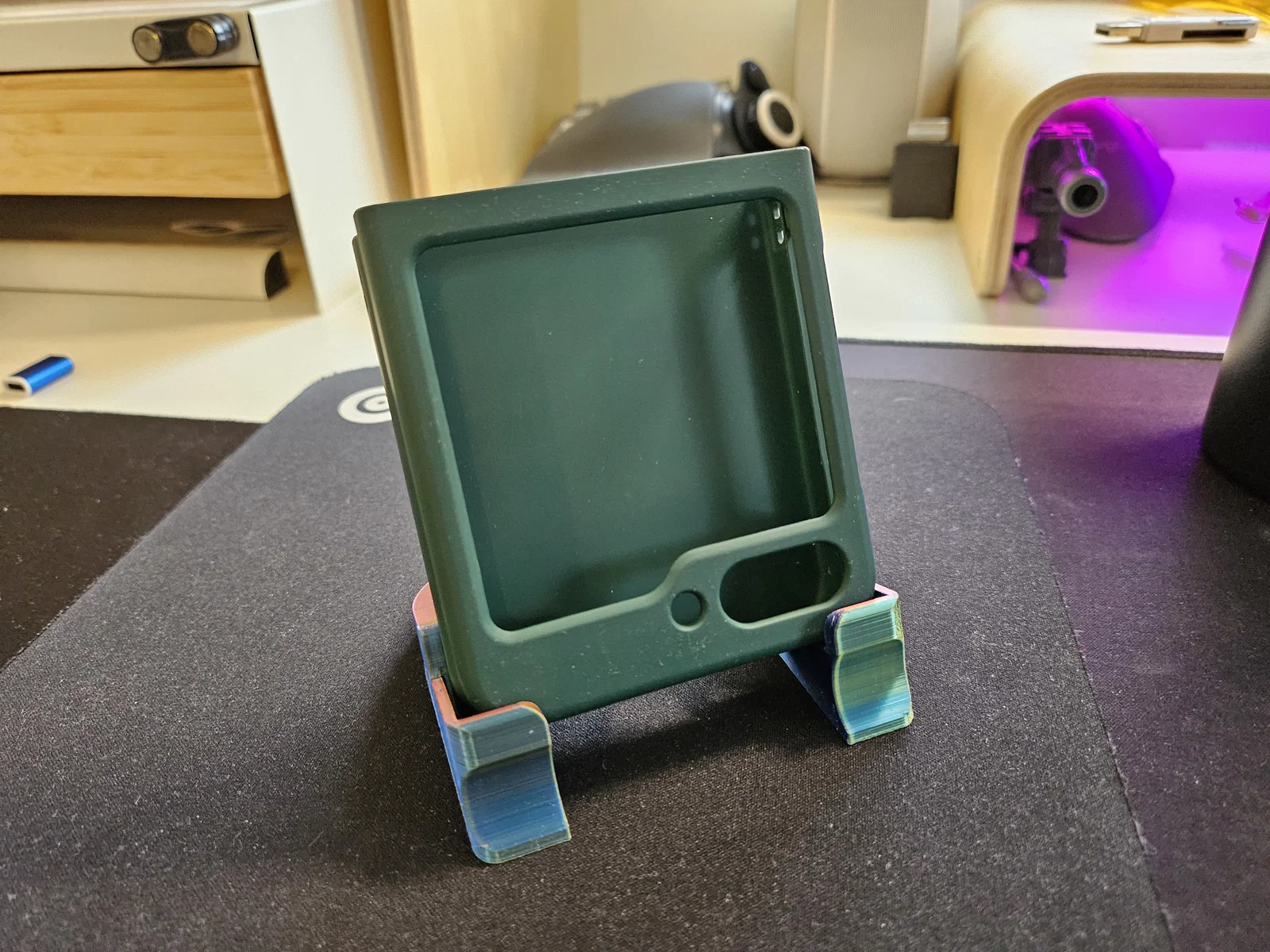 Cái đế điện thoại này được thiết kế để giữ máy Samsung Z Flip dù đang mở hay gập, mà vẫn không hề che khuất micro hay loa của máy.