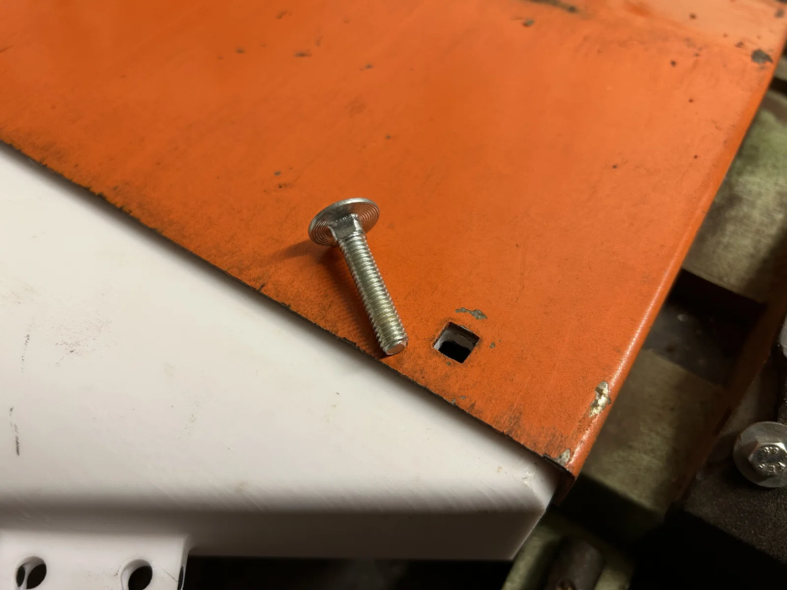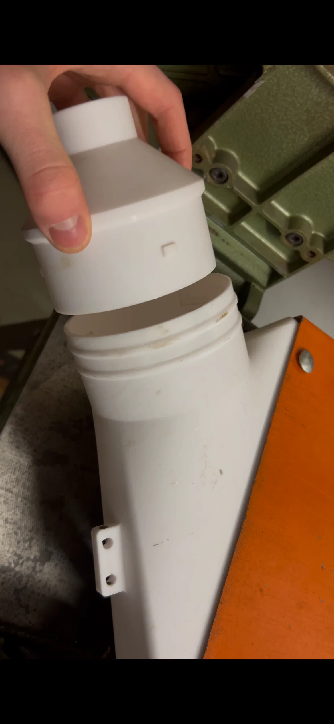 Nếu thấy nó gắn chưa đủ chặt vào phần ốp, bạn có thể khoan hai lỗ trên bộ chuyển đổi sao cho khớp với hai lỗ vuông trên phần ốp màu cam. Sau đó chỉ cần xỏ hai con bu-lông vào là nó sẽ không bị rơi ra nữa.