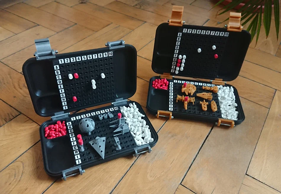 Phần hộp, bảng chữ, số và chốt được in bằng nhựa PLA (không cần dùng support), còn các mô hình tàu và bản lề được in bằng nhựa ColorFabbs nGen (hầu hết đều cần dùng support).
