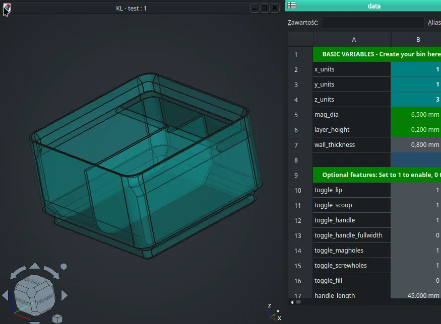 Mình cần thực hiện vài thay đổi trên thiết kế gốc, và những chỉnh sửa này mang lại rất nhiều tiềm năng thú vị. Việc thay đổi góc tay cầm giúp bạn có thể in với độ nghiêng (overhang) ví dụ như 70 độ, hoặc tạo các cấu trúc cầu (bridge) ở góc 90 độ. Các cấu trúc cầu này hoạt động rất tốt với các vách ngăn, thứ mà bạn có thể tùy chỉnh theo những cách độc lạ để tạo ra các hộp không đối xứng. Ngoài việc điều chỉnh góc độ, bạn còn có thể thay đổi góc bo của hốc (scoop), cho phép bạn tạo ra một mặt phẳng đơn giản ngay phía cạnh lấy đồ của chi tiết.