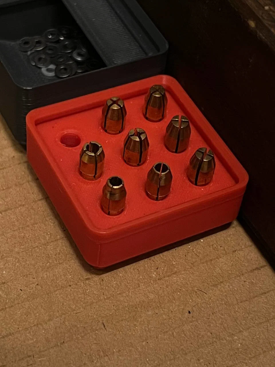 Đối với những anh em thợ hoặc những người thường xuyên làm việc với máy khoan cầm tay Dremel, việc thất lạc các đầu kẹp (collets) có kích thước khác nhau là chuyện thường tình. Bộ đầu kẹp này tuy nhỏ nhưng lại cực kỳ quan trọng, nếu để lung tung trong hộp đồ nghề sẽ rất dễ bị mất hoặc khó tìm khi cần thay đổi kích thước mũi khoan. Mẫu thiết kế khay Gridfinity này ra đời nhằm giải quyết triệt để vấn đề đó, giúp góc làm việc của bạn trở nên gọn gàng và chuyên nghiệp hơn hẳn.