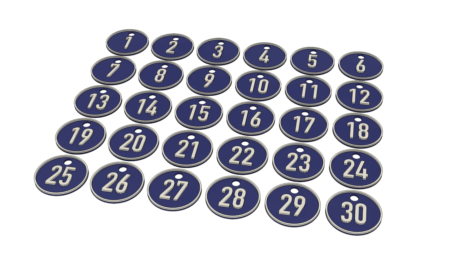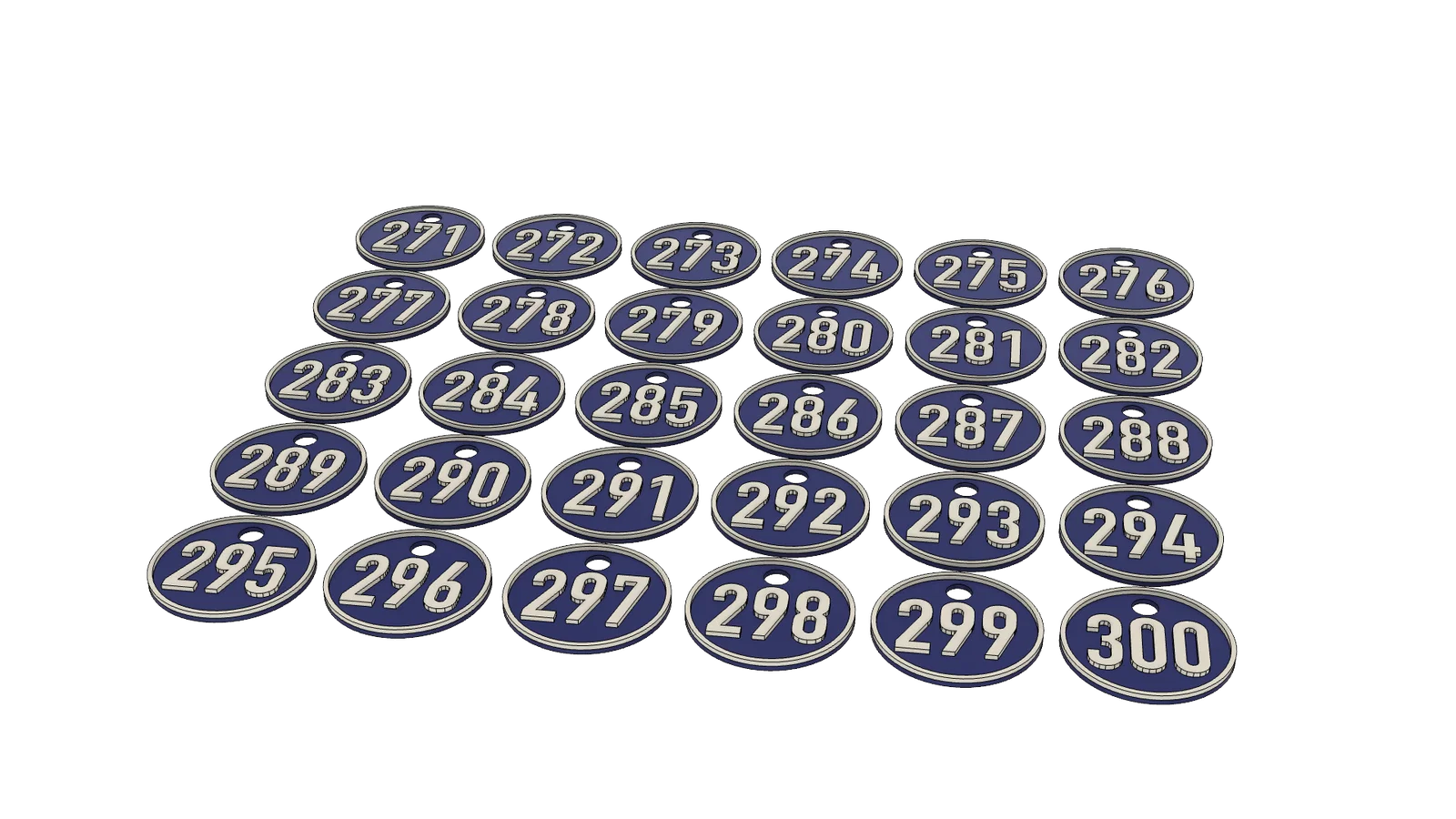 Mẫu móc khóa/dog tag đường kính 32 mm với các số từ 1 đến 300 đã được thiết kế sẵn. Bạn có thể in 2 màu dễ dàng mà không cần MMU/AMS bằng cách đổi filament trong slicer. Ngoài ra còn có tag trống để bạn tự tùy chỉnh nội dung theo ý muốn.