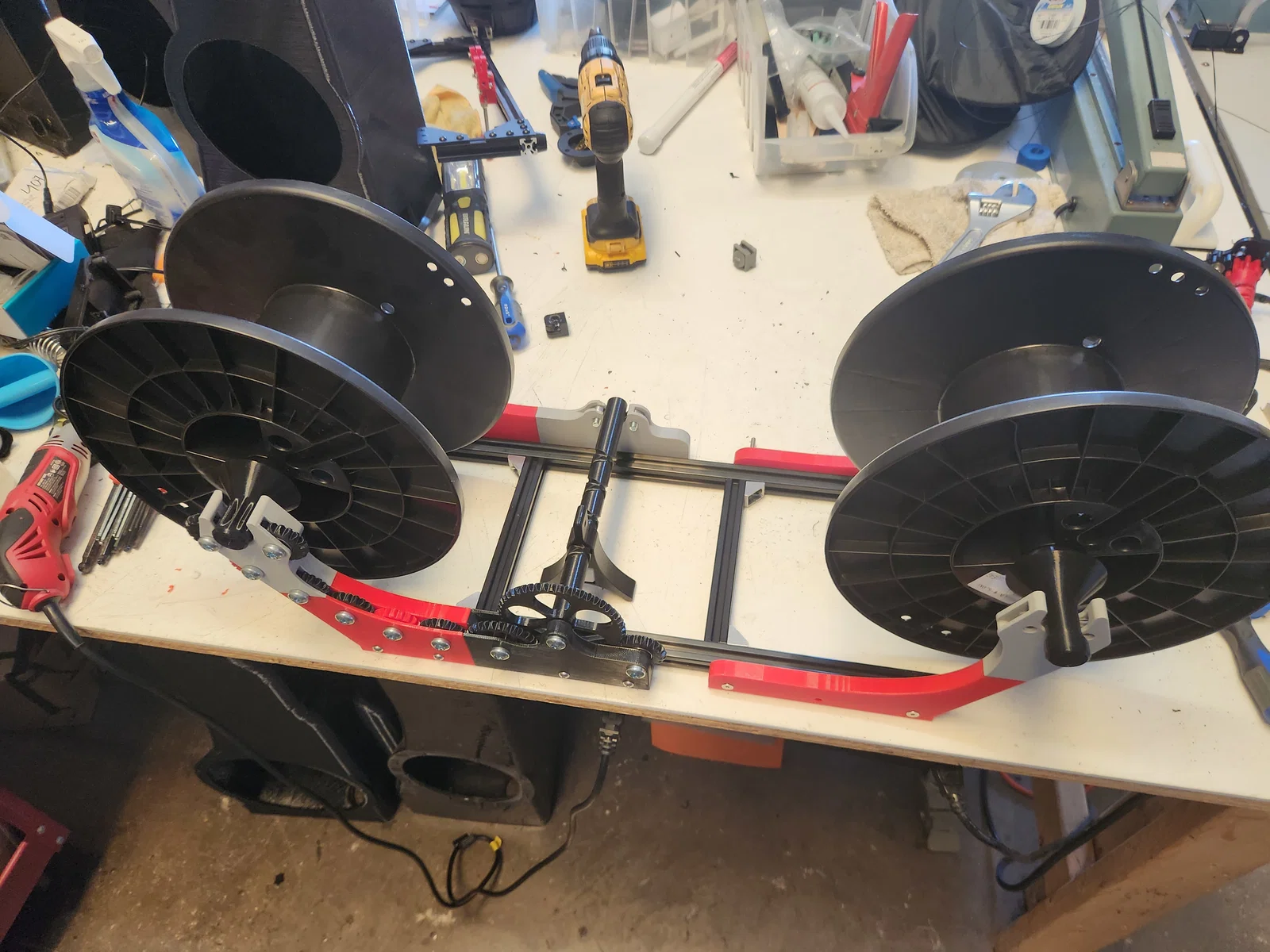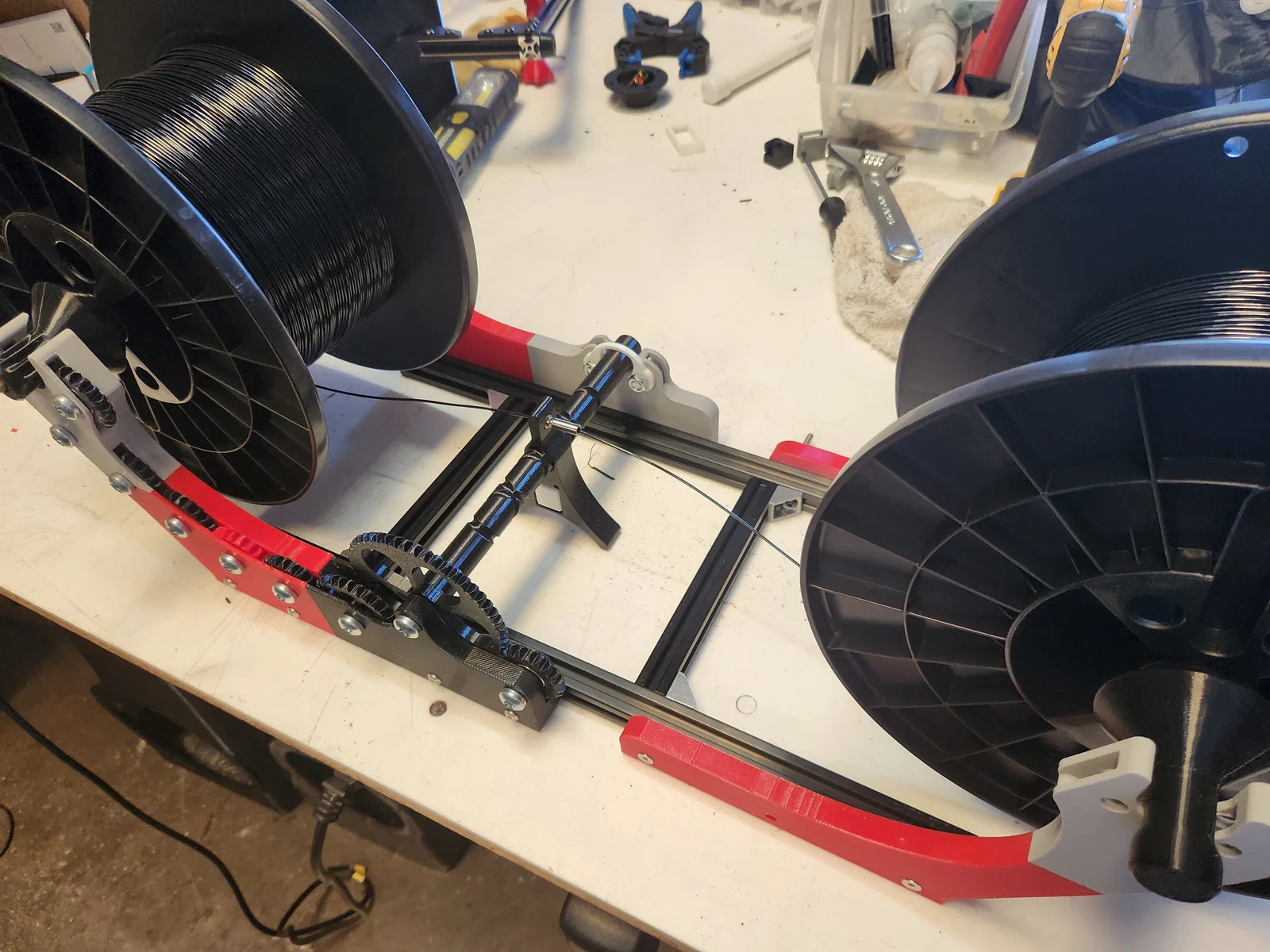 Đây là bản cải tiến từ Pastamatic Winder của GekoPrime, được nâng cấp để hỗ trợ quấn các cuộn nhựa 5Kg. Thiết kế sử dụng khung nhôm định hình 2020 với các trục và giá đỡ chắc chắn hơn, giúp việc kết hợp nhiều cuộn nhựa nhỏ thành cuộn 5Kg trở nên dễ dàng.
