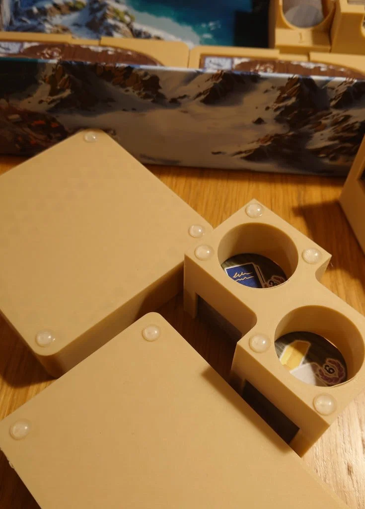 Lưu ý quan trọng!: Một vài hộp dùng để đặt lên bàn khi chơi và hộp đựng tài nguyên đã được làm thấp hơn 2,5mm để dành chỗ dán miếng đệm silicon chống trượt ở dưới. Các file này được đánh dấu (pads) trong tên file. Nếu bạn không định dùng miếng đệm, bạn hoàn toàn có thể phóng to chiều cao của các mẫu này thêm 2,5mm mà không gặp vấn đề gì. Mình có đính kèm ảnh chụp phần đáy của các hộp có dán miếng đệm để các bạn tham khảo.