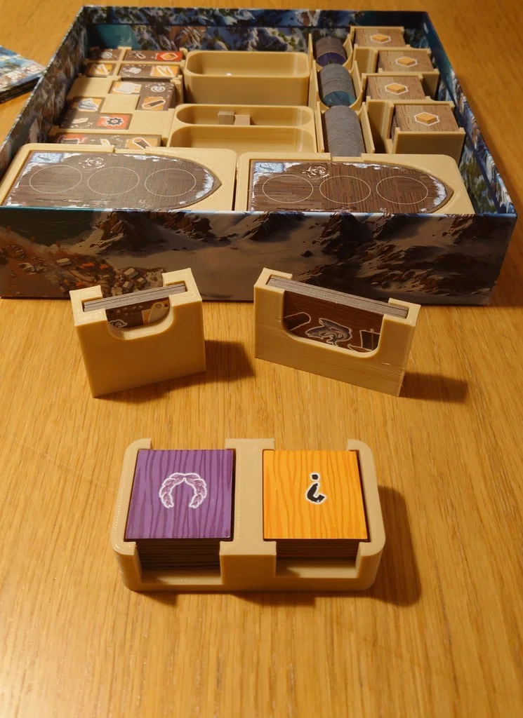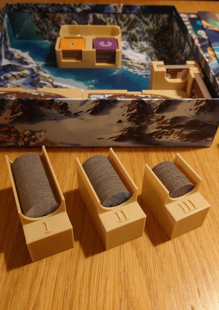 Mình thấy việc thiết lập game này từ mấy cái túi nhựa thật sự rất phiền, nên mình muốn làm một bộ insert giúp mọi thứ nhanh gọn và dễ dàng hơn. Các mẫu hiện có trên thị trường không lấp đầy toàn bộ hộp, dù thiết kế nhỏ hơn cũng được nhưng mình vẫn muốn bản thiết kế này lấp đầy cả cái hộp để việc cất giữ gọn gàng hơn. Các thùng đựng và tòa nhà có thể đặt thẳng lên bàn chơi, còn hộp của người chơi thì đã có đủ mọi thứ cần thiết cho mỗi người. Bản in của mình thì không thấy rõ màu sắc của người chơi, nhưng nếu bạn muốn thì có thể in các hộp này bằng các màu khác nhau nhé.