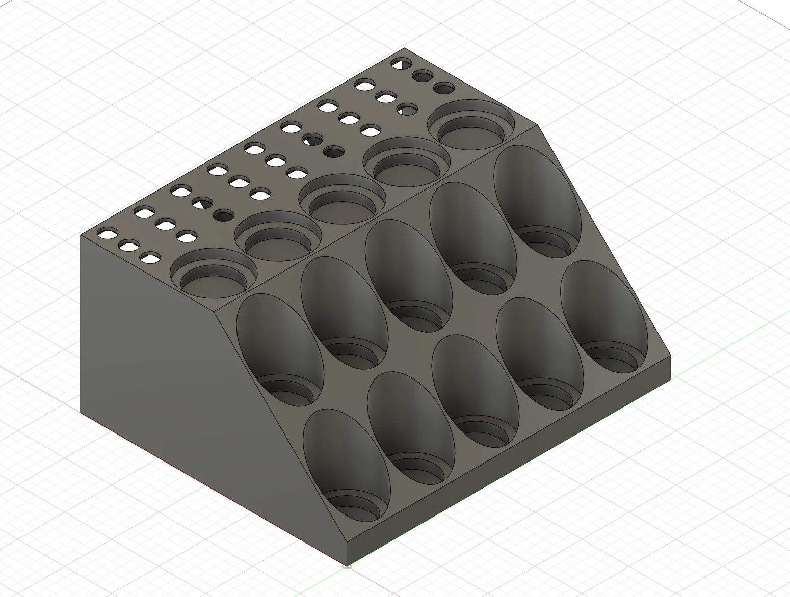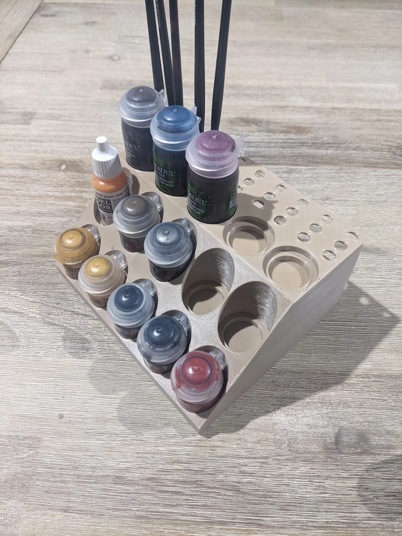 Đây là mẫu giá đỡ sơn và cọ được thiết kế chuyên dụng để chứa 15 hũ sơn Citadel (33mm) hoặc Vallejo (25mm), cùng với chỗ để 27 cây cọ vẽ. Thiết kế đã được tối ưu hóa với các cấu trúc hỗ trợ (supports) và bắc cầu (bridging) tích hợp sẵn, giúp giảm lượng nhựa in tiêu thụ ước tính từ 411g xuống còn 191g. Bản v2: Đã thêm phần vành (brims) xung quanh các lỗ cắm cọ để tăng cường độ ổn định khi sử dụng.
