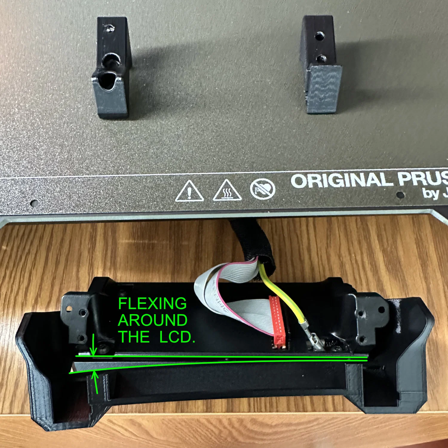 Mình thấy việc lắp nắp đậy vào màn hình LCD sẽ dễ dàng hơn khi tắt máy in và rút hết dây cáp ra khỏi màn hình. Các file này khi in không cần hỗ trợ (supports). Phần nắp cần phải có độ dẻo để ép chặt vào màn hình LCD. Bạn hãy trượt cạnh dày vào trước, sau đó trượt cạnh mỏng vì phần này sẽ tự uốn cong để khớp vào. Hãy xem ảnh minh họa độ uốn cong của nắp khi lắp được một nửa. Tiếp theo, nhét một đai ốc M3nS vào khe trên mỗi giá đỡ (làm cho 2 bên). Bạn nên thử vặn vít M3x6 vào đai ốc vừa lắp để kiểm tra trước. Bây giờ, căn chỉnh đúng khe hướng dẫn trên giá đỡ rồi trượt vào nắp. Sử dụng 4 ốc vít đặc biệt 3x12sT mà Prusa cung cấp để cố định các giá đỡ vào màn hình LCD. Thao tác này sẽ ép chặt nắp vào màn hình. Cuối cùng, gắn màn hình LCD và nắp lên mặt ngoài của thùng máy Prusa bằng hai vít M3x6. Chúc các bạn thực hiện thành công!