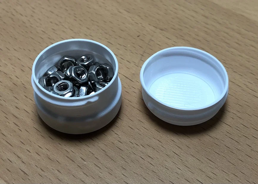 Nhờ sử dụng chế độ Spiral Vase Mode (chế độ in bình hoa), thời gian in rất nhanh và tiết kiệm nhựa. Nắp hũ vặn vào với ren xoắn chỉ cần xoay 3/4 vòng. Dung sai được làm lỏng một chút để bù trừ cho độ sai lệch của máy in. Trên ren có một nấc chặn giúp giữ nắp cố định, không sợ bị lỏng ra.
